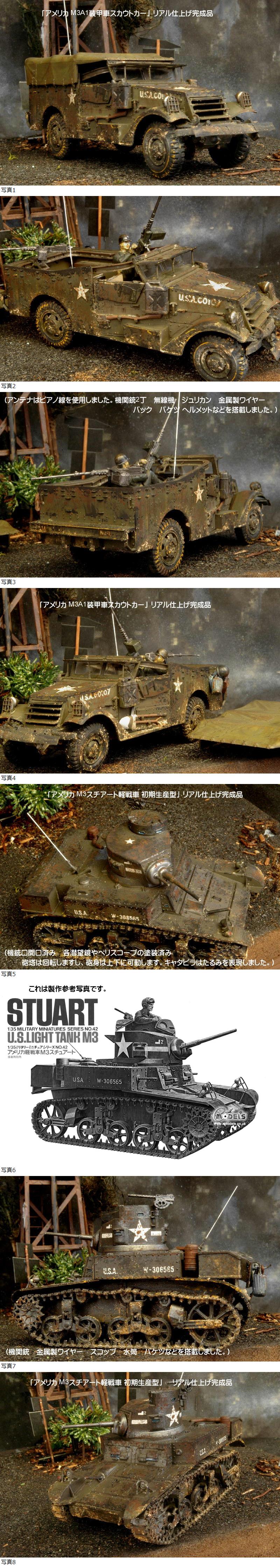 | ■今回の作品もジオラマではなく、2両編成完成品です。当店委託のプロモデラーが「ヘアスプレーチッピングや汚し塗装等」を施工するなどリアルに製作しており、クオリティは以下の商品説明の画像でも確認して下さいね。(撮影に使用したジオラマ展示台は、商品ではありませんよ。) ① 1/35 「アメリカ M3A1装甲車スカウトカー」 リアル仕上げ完成品 (アンテナはピアノ線を使用しました。機関銃2丁 無線機 ジュリカン 金属製ワイヤー バック バケツ ヘルメットなどを搭載しました。)アメリカ兵1人を搭乗させました。アメリカ兵と幌カバーは取り外し可能ですよ。 ※ M3A1装甲車スカウトカーは、斥候(スカウト)用装甲車で、1940年から1944年までに20,918輌が生産され、北アフリカ戦線やノルマンディー上陸作戦にも使用されるなど大戦末期まで運用されました。 ② 1/35 「アメリカ M3スチアート軽戦車 初期生産型」 リアル仕上げ完成品 (アンテナはピアノ線を使用しました。機関銃 金属製ワイヤー スコップ 水筒 バケツなどを搭載しました。) ※M3スチアート軽戦車は、1942年8月までに計5,811輌が生産されており、偵察任務等で大戦末期まで運用されました。 ■緻密で繊細に製作しており、とても精度の高い作品ですが、史実に忠実に表現したわけではありませんよ。(1944年9月頃 オランダ ニューネン近郊でのマーケットガーデン作戦を想定しました。 マーケット・ガーデン作戦では、ニューネン近郊に東部戦線で運用されていたドイツ第9SS装甲師団などが、部隊再編のため一時駐留していたという不運も重なり、イギリス第1空挺師団が壊滅するなど連合軍が敗退しております。) ■ヤフー画像検索で「PP工房完成品」と検索いただければ、当店の最近の作品の画像を見ることができますので、そちらも見ていただければ幸いです。・・・PP工房完成品 ★使用パーツなど(以下の作品がすべて付いてきますよ。) 1 1/35 マックス M3A1装甲車スカウトカー(機銃口開口済み)アメリカ兵1人を配置しました。 2 1/35 タミヤ M3スチアート軽戦車(機銃口開口済み 各潜望鏡やペリスコープの塗装済み 砲塔は回転しますし、砲身は上下に可動します。キャタピラはたるみを表現しました。) ■当店(PP工房)では、プラモ完成品を週3回位の割合で出品しておりますので、よろしくおねがいしますね。 | |