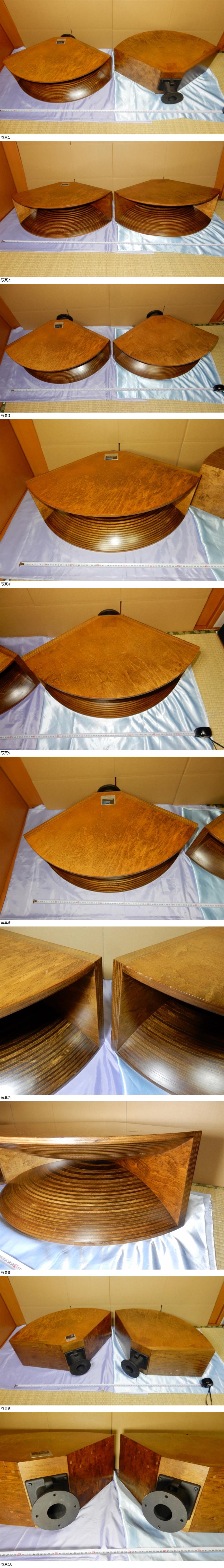 状態ですが、使用に伴う小さな当て傷がります。経年の劣化なのか?ホーン内面を見ると積層部分が少し凹凸が出てきている箇所があります。(写真10枚目参照)名板が片側ありません。上面にトゥイーターなどを載せていた跡があります。(写真では分かりにくいです)経年の変色やクスミ等があり、スロートの取り付けボルトに酸化が確認できます。枚数の制限で全ての傷を写しきれておりませんので御理解お願いします。
