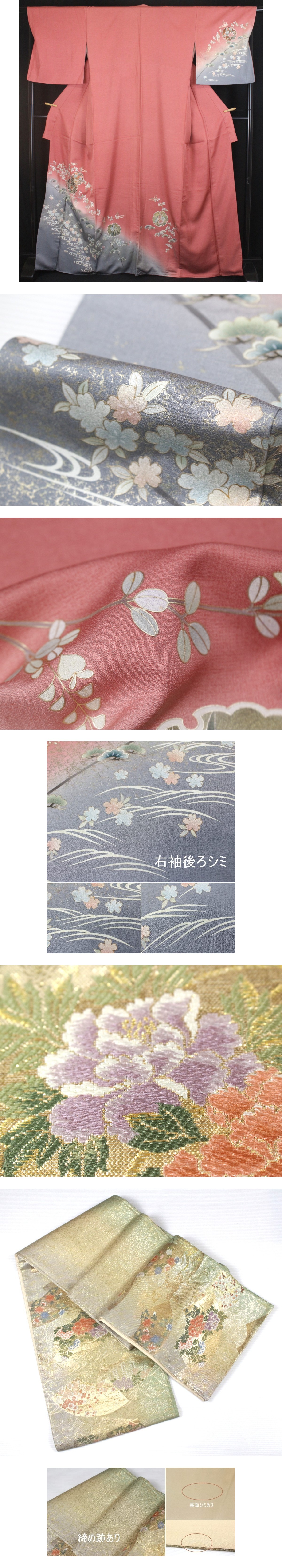 水辺風景と四季草花が美しい、正絹訪問着と袋帯のセットのご紹介です。 やわらかな正絹の地に、金彩加工を用いて水辺風景図と流水文を描いた、情緒豊かな文様が表されました。 裾から身頃にかけて流れる構図に、松・小花などの花意匠が配され、自然の移ろいを感じさせるやさしく上品な印象に仕上げられています。松は長寿・繁栄を象徴する吉祥文様、流水文は清らかさや永続性を意味するおめでたい意匠です。 袋帯は、金地を基調に、牡丹・菊・桜・楓などの草花文様を優美に織り出した格調高い意匠。 華やかさの中に品格があり、訪問着の水辺風景と美しく調和する、統一感のある一本です。 式典やお祝いの席、ご結婚関連行事、お食事会や観劇などにも対応できる、フォーマル寄りのコーディネートです。 お目に留まりましたら是非ご検討くださいませ。 ※撮影時の部屋の照明によって画像の色に若干の差がございます。色味に差がございますことをご了承のうえご検討下さいませ。 …状態… 着物:右袖後ろ、前身頃にシミあり 帯:締め跡。裏面にシミあり。 ※全くの新品ではございませんので、記載のない変色やスレ、ヤケ、その他僅かな難がある場合がございます。そのような理由でのキャンセルはお受けできませんので、ご了承の上ご検討お願いいたします。 |