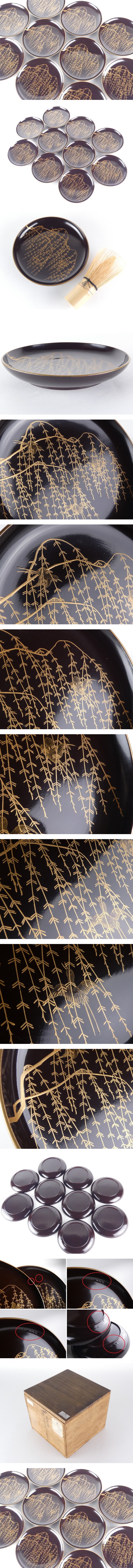 【扇屋】 時代 柳鳥蒔画 菓子盆 10客 幅 約13.5cm 高さ 約2cm 木製 溜塗 花鳥蒔絵 菓子器 菓子皿 銘々皿 漆芸 漆器 蒔絵 花鳥 F-1 收藏