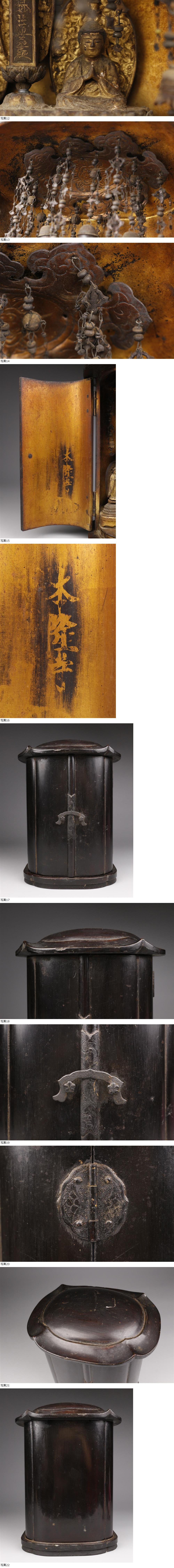 260323n12* * * 商品詳細 * * * ここでしか出逢うことのできない唯一の美をご紹介させて頂きます。 本隆寺ゆかりの、歴史が伺える厨子入り一塔両尊像 日蓮聖人像のご紹介です。 厨子の内部には一塔両尊を安置し、中央には髭題目の宝塔、 手前には慈日蓮聖人坐像を配した豪華な構成となっております。 厨子には焼けずの寺(不焼寺)」として名高い本隆寺の文字が伺え、 木彫金彩の細工は実に精緻で、台座の唐獅子や宝塔の題目、光背の唐草文様に至るまで、 当時の職人の技術力と情熱が込められています。 この機会に是非お手元にてご堪能ください。 ■サイズ/横17cm×高25.5cm×奥行13.3㎝ ■状態/スレ、傷、錆び、剥げ、直し、欠損、曲がり、経年による傷み、欠け、へこみがございます。 ※写真にてご確認、ご了承の上ご入札下さい。 * * * 支払詳細 * * * !かんたん決済 * * * 発送詳細 * * * 入金確認後3営業日以内に発送致します。 ※直接引き取りも可能です。 60~160サイズにつきましては 佐川急便、ゆうパックのどちらかで発送いたします。 ゆうパック発送の場合、弊社の発送日から追跡サービスに問合せ番号が反映されるまで 約1日ほどお時間がかかりますのでご了承下さい。 高額での落札の場合チャーター便になる可能性がございます。 ご了承ください。 * * * 注意事項 * * * 運送中の破損があった場合は速やかに当社までご連絡下さい。 保険を利用するのに受取連絡後に運送会社による現場での破損状況確認が必要となります。 勝手に返送されますと保険の適用外となりますのでご注意ください。 * * * * * * お問い合わせ:082-236-8669 |