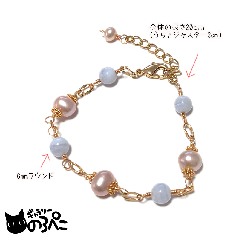 ピンク淡水パールとブルーレースアゲートのブレスレット(ピンク淡水パールと空色縞瑪瑙を交互に繋いだ天然石ブレスレット) aa458-713 收藏