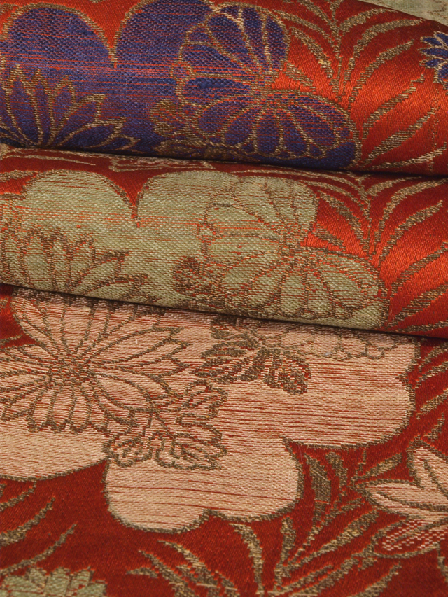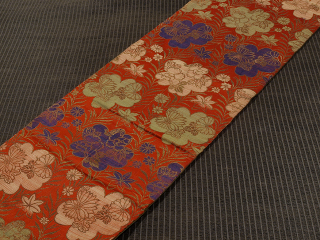 紅緋色の地に、桜と菊、楓(かえで)、牡丹(ぼたん)などの文様が織り込まれている、緞子の帯地のはぎれです。 明治末から大正期ごろにつくられたと思われるアンティークのお品です。大ぶりの桜の陰影がかわいらしい印象です。 半幅帯として使われたようで、中央に折り目があります。また、裏地が付いた帯の形になっていますが、両端が裁断されています。そのほかに目につく大きなしみやよごれなどのダメージはなく、この時代のものとしてはきれいな状態です。生地の力はまだまだあります。 |