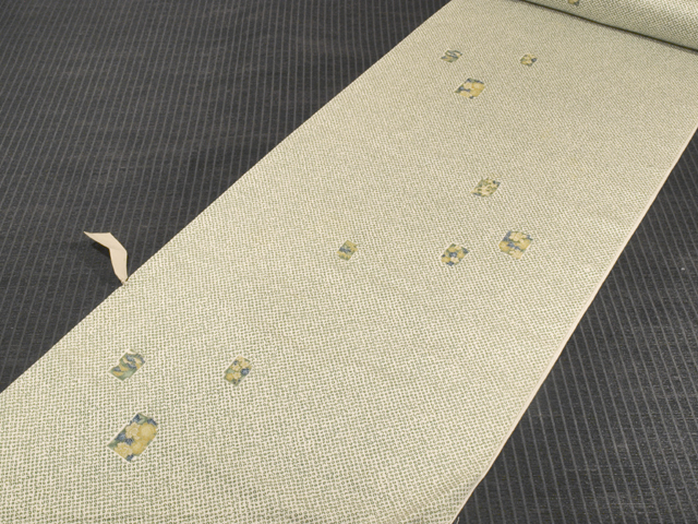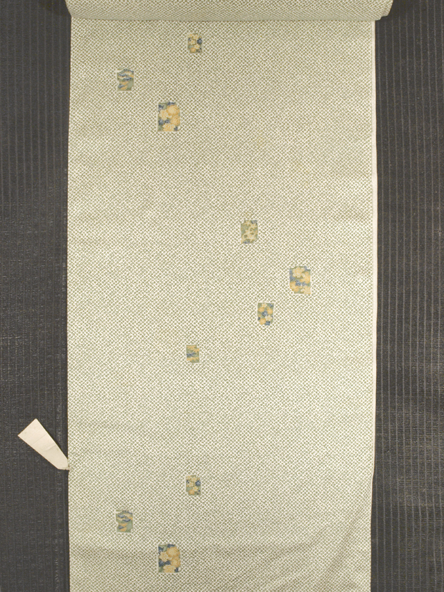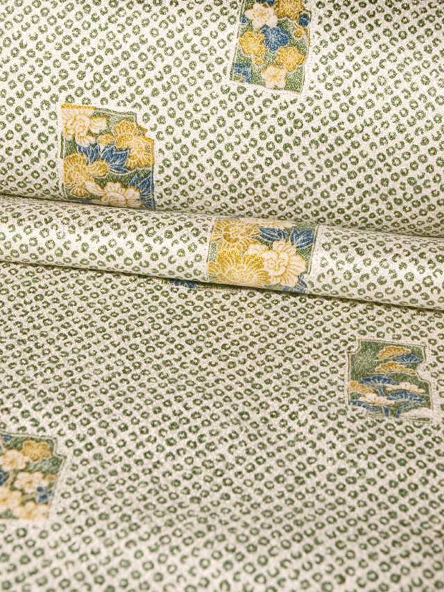 白練(しろねり)色の地にこまかな霜降りの地紋が織り出され、千歳緑色の鹿子(かのこ)の地紋と楓(かえで)や松、梅、菊、牡丹(ぼたん)、橘(たちばな)などの草花の配された色紙の文様が染められている、紋綸子縮緬の小紋の反物です。 さわやかなお色目とシンプルな意匠が小粋で渋みのあるきりっとした美しさを醸しています。なめらかでやわらかな手ざわりの上質な綸子地です。 未仕立て未使用保管品です。中心から両端にかけてそれぞれ約 110cm の範囲に直径約 1-3cm のごくうっすらとした黄変が数か所ありますが、あまり判別はつきません。そのほかに目につくしみやよごれ、褪色、穴などのダメージはなく、全体的にはきれいな状態ですが、状態ランク=「D」のご着用対象外、リメイク素材用とさせていただきます。 |
