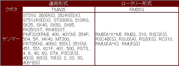 | ヤンマー | ST310、350(RS)、352RS(DX)、ST512RS(DX)、ST300RS、510RS、SK35、SK40、SK50、SK65、RK35GST、RK40GST、PMT320(RM)、400、401(N)、354P、504、5P、HK40、MT300、PRT35(N)、40(N)、55(K)、351(N)、451、551、621F、401、500、PST3、4、6、40、60、ST4、PSC3(S)、40(S)、60(S)、70(S)、2、20、30、4(B・BS) | RM3(A・K・M)、RM33、310、RSC3(S)、RSC4B(S)、RSU3(A)、RS30(S)、RC310、RMU3(A・K)、RMU(G3) |