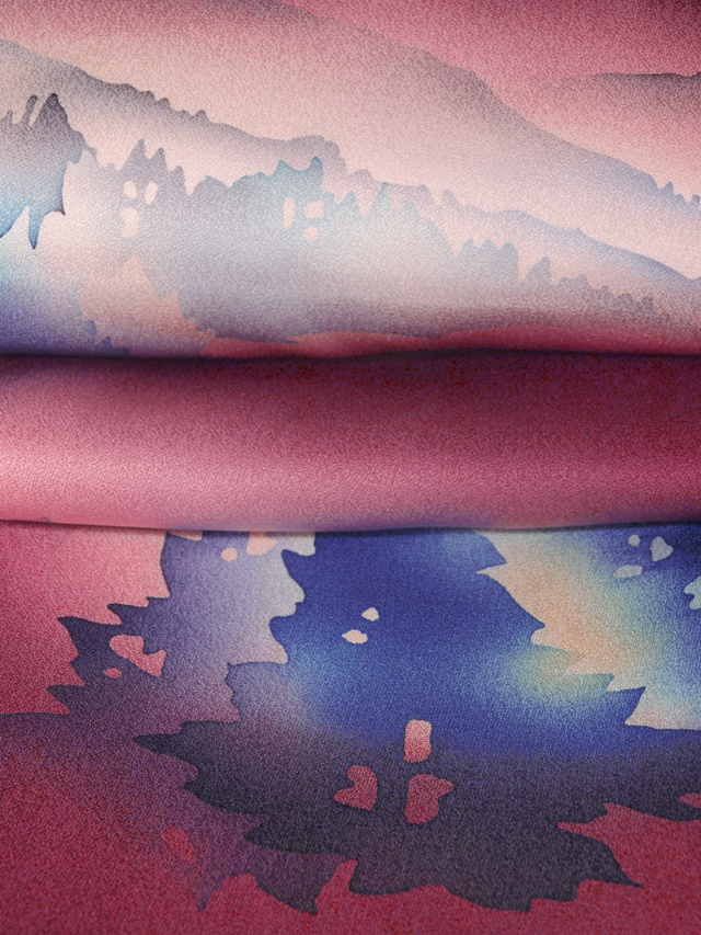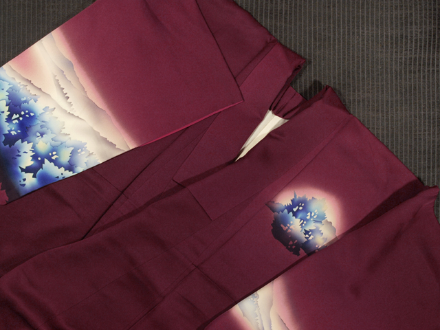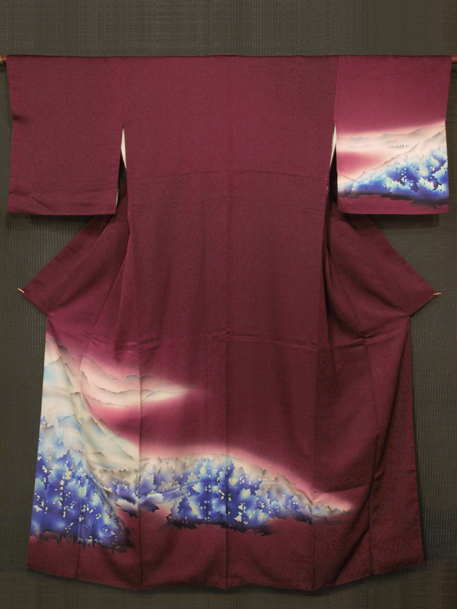 深く沈んだ葡萄(えび)色の地に、ごくこまかな霜降りの地紋が織り出され、遠山の裾野に樹林が広がる風景の文様が染められている紋綸子の付下げです。袷仕立てです。 静謐さを醸す風景が幻想的な趣であらわされています。なめらか、やわらかな手ざわりの綸子地です。 ユーズド品ですが、目につく大きなしみやよごれ、褪色などのダメージはなく、良好な状態です。 |