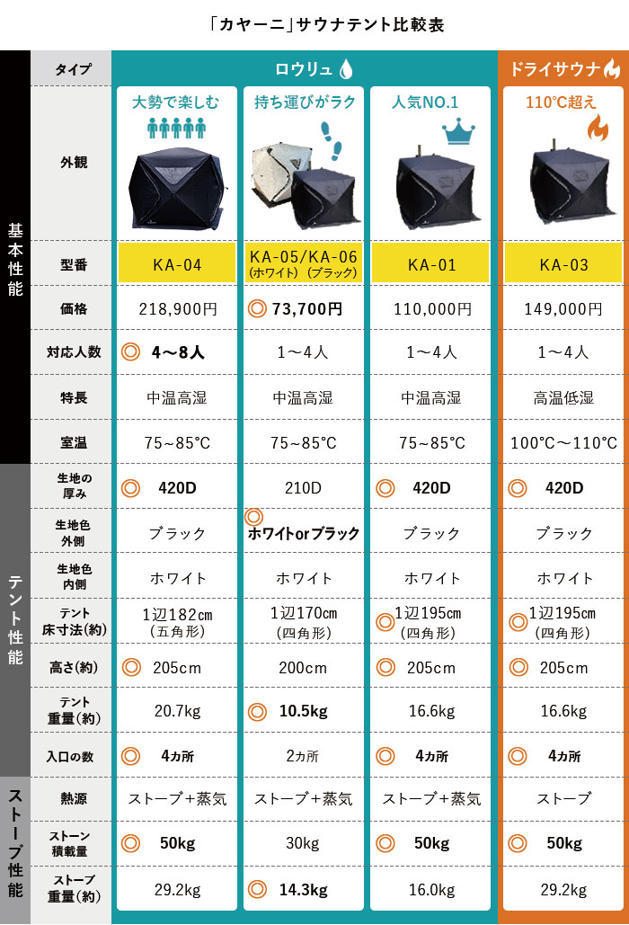 定番のカヤーニKA-01に比べ約6.1kgのテントの軽量化に成功!収納サイズも幅・高さ5cm・奥行20cm減!持ち運びやすくなり「キャンプ+サウナテント」も気軽に。