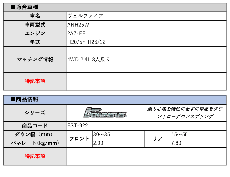 [エスペリア]ANH25W ヴェルファイア(4WD 2.4L 8人乗り_H20/5~H26/12)用スーパーダウンサス[車検対応] 收藏
