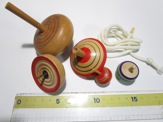 昭和レトロ★独楽 コマ 木製玩具 合計5個 鉄芯独楽1個 郷土玩具 最大直径6.7cm 最小直径2.4cm ヒモ1本★ 收藏