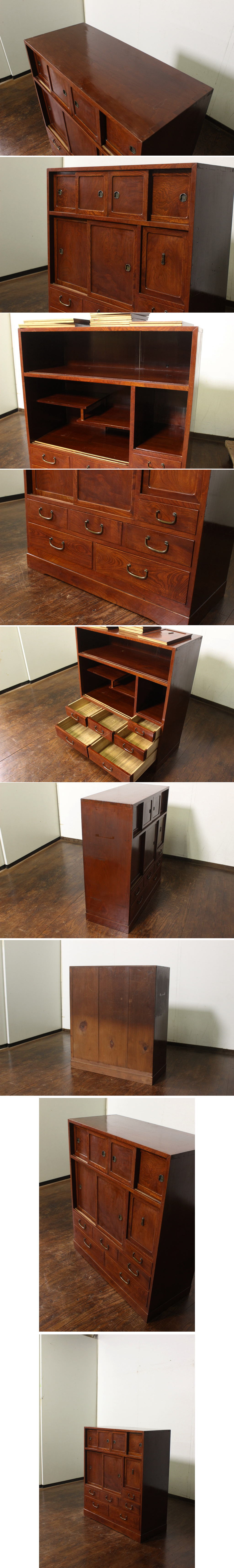 上部は引戸と、下部には引出し収納とバランスの良いレイアウトです。 前面は鮮やかな印象の綺麗な欅杢。 和のアイテムとして勿論、モダンな洋のインテリアとしてもオススメです。 レトロ・アンティークな雰囲気作りにご活用下さい。 |