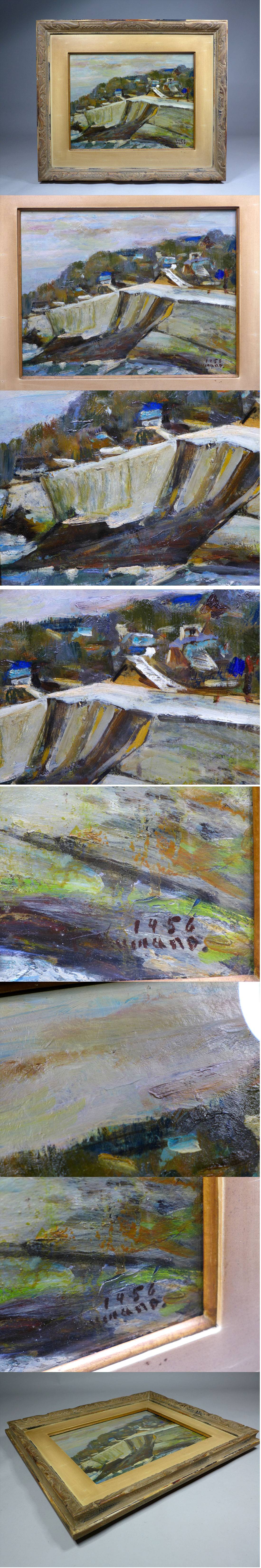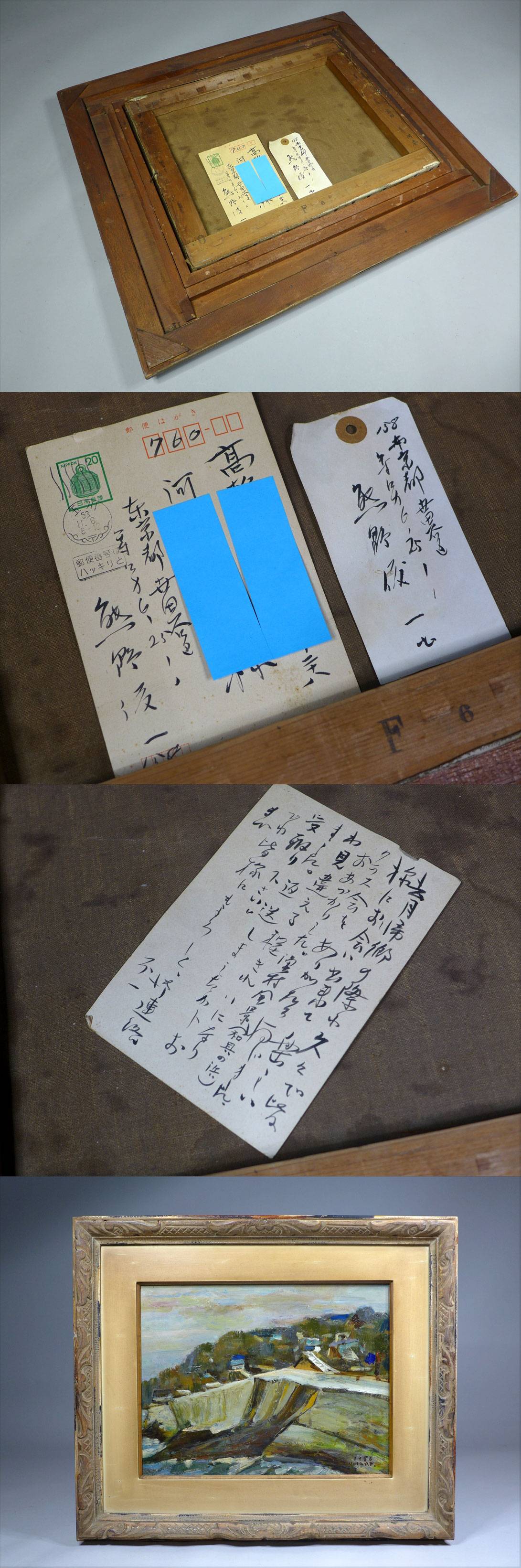 額寸約60,5x51cmです。写真の通り、譲った方あての本人直筆葉書が付いております。『熊野俊一 漁村(和具の浜)F6号 1956年』です、お好きな方どうぞ!時代なりで経年感あります。上部の方に絵の具ヒビ、サインあたりにハガレ個所も見えます。ご了承ください。内容や状態などは画像参照でお願いします。xvpbvx |