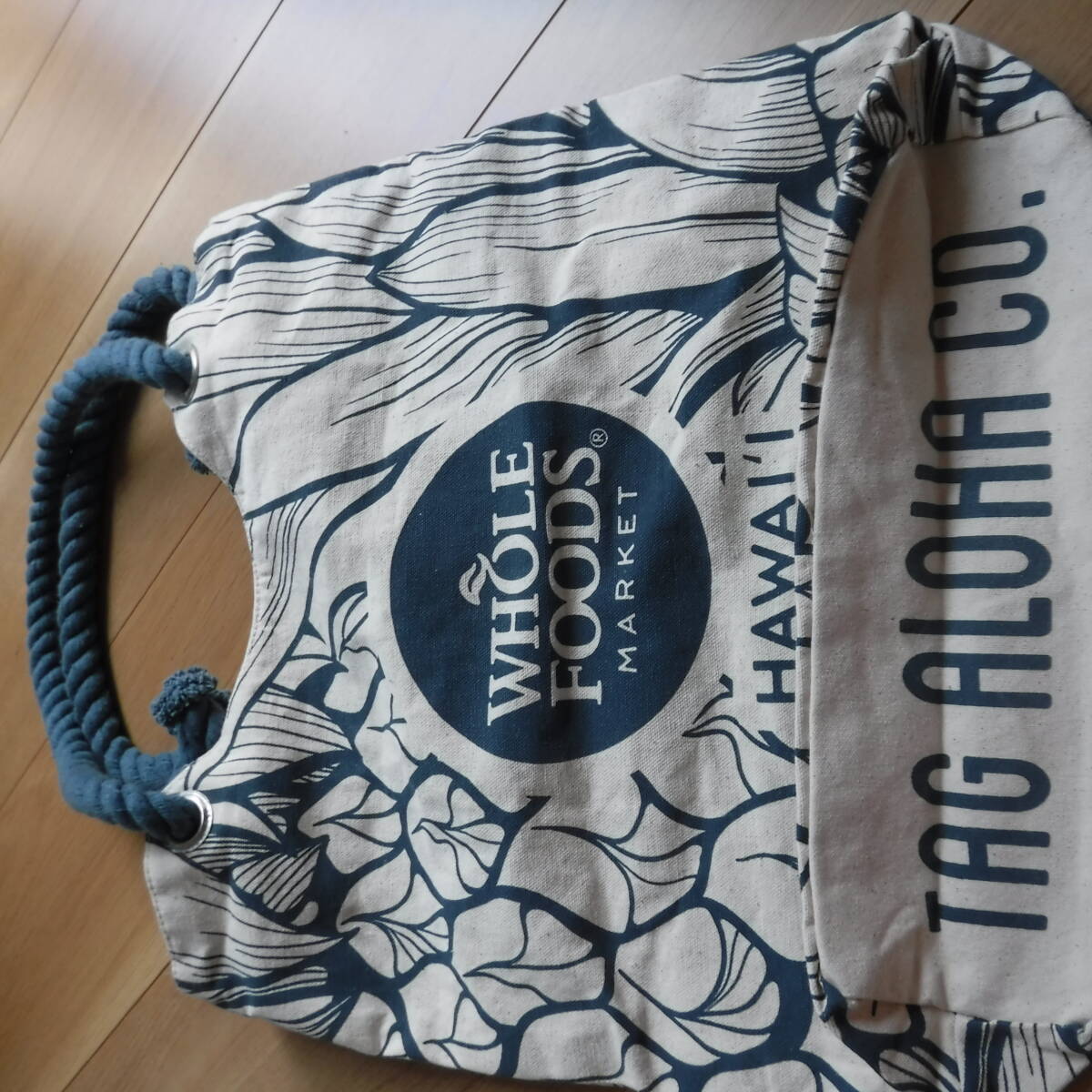 税不要特価 ハワイ購入 極美品!WHOLE FOODS ホールフーズ ホワイト×ブルー ロゴ ハワイアンボタニカル 持ち手ロープ トートバッグ♪大 收藏