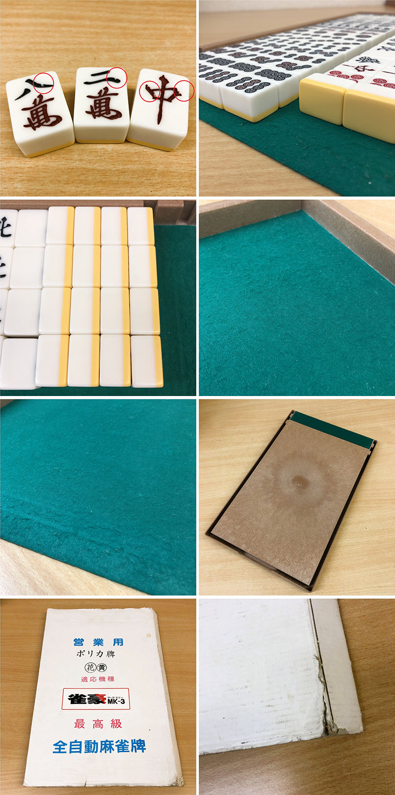 こちらは全自動麻雀卓「雀豪MK-3」専用 全自動麻雀牌 雀豪マーク3 148牌 ポリカ牌 黄色です。 中古品です。 全自動麻雀卓【雀豪MK-3(マークスリー)】の専用牌です。 字体の大きな見やすい牌です。 【コンディションについて】 使用に伴うスレや、一部の牌に文字のかすれがあります。(画像参照) 大きく目立つダメージなどは見受けられませんでした。 牌の種類については画像でご判断下さい。 専用トレイには底面に毛羽立ちなどが見られます。 パッケージに破れや汚れがあります。 詳細につきましては下記画像も併せてご参照ください。 ![]() 再良市場の他のお品物はこちらから!