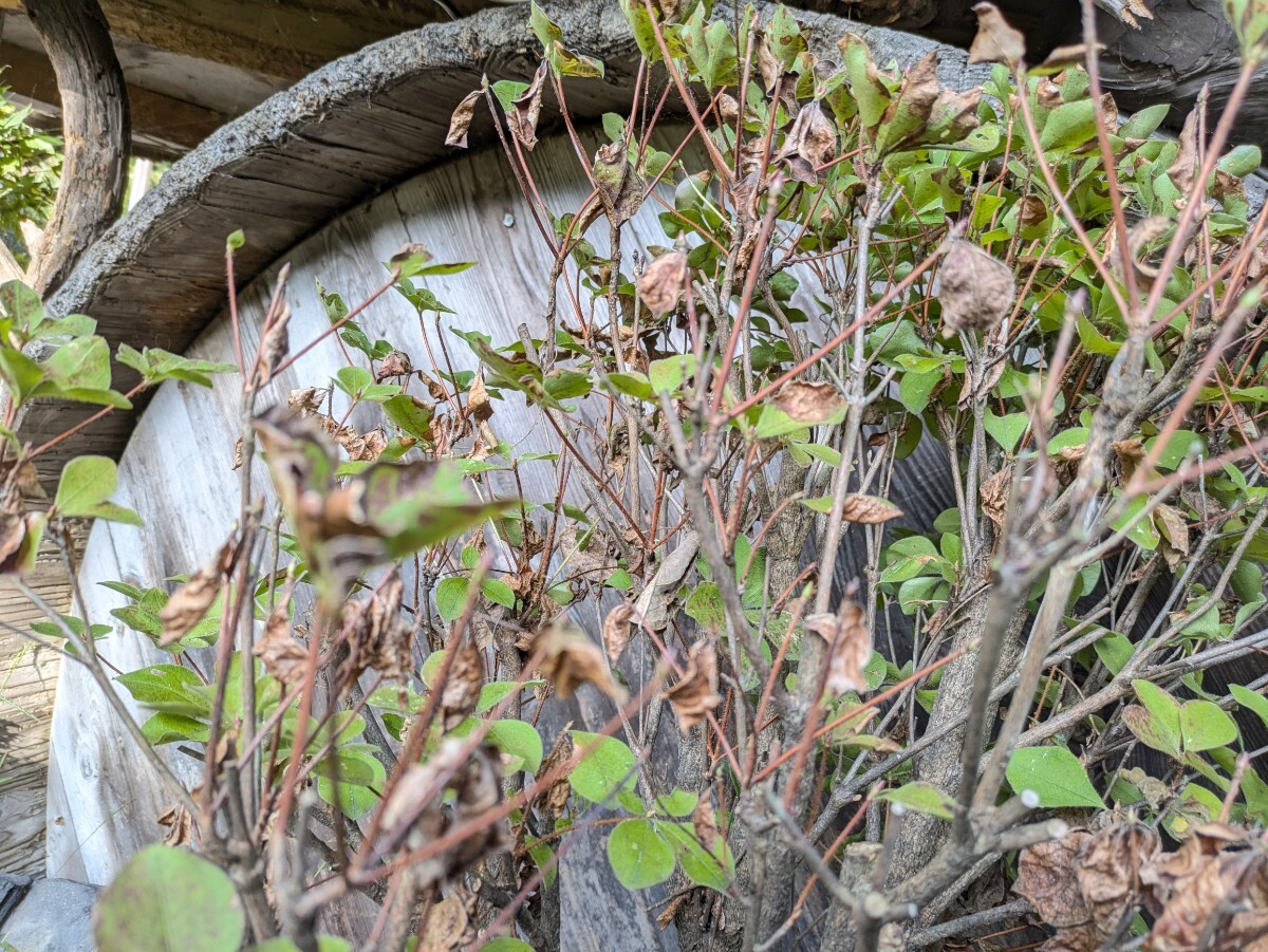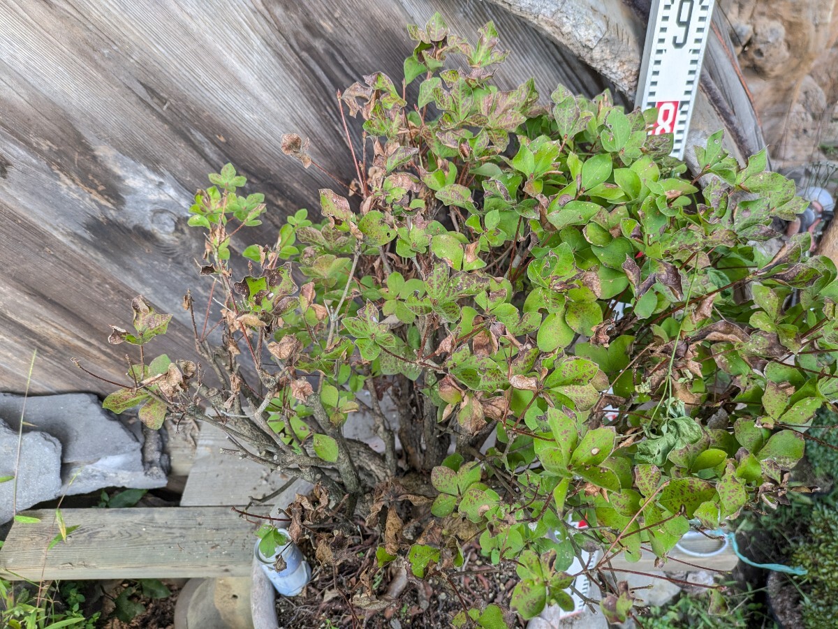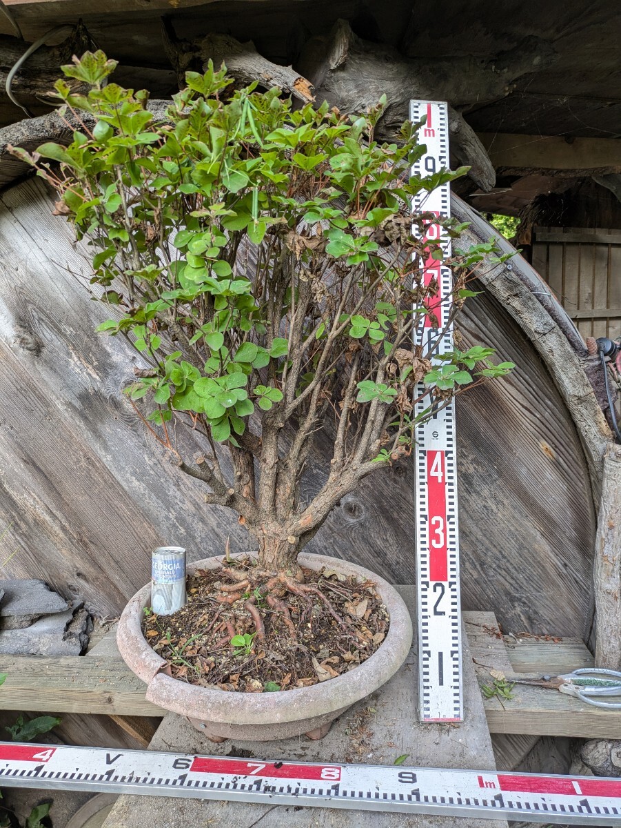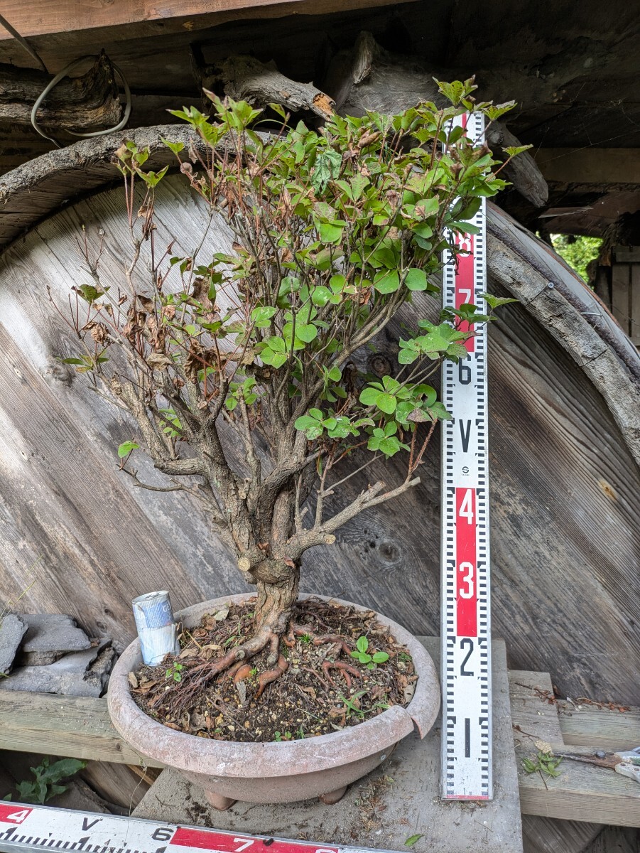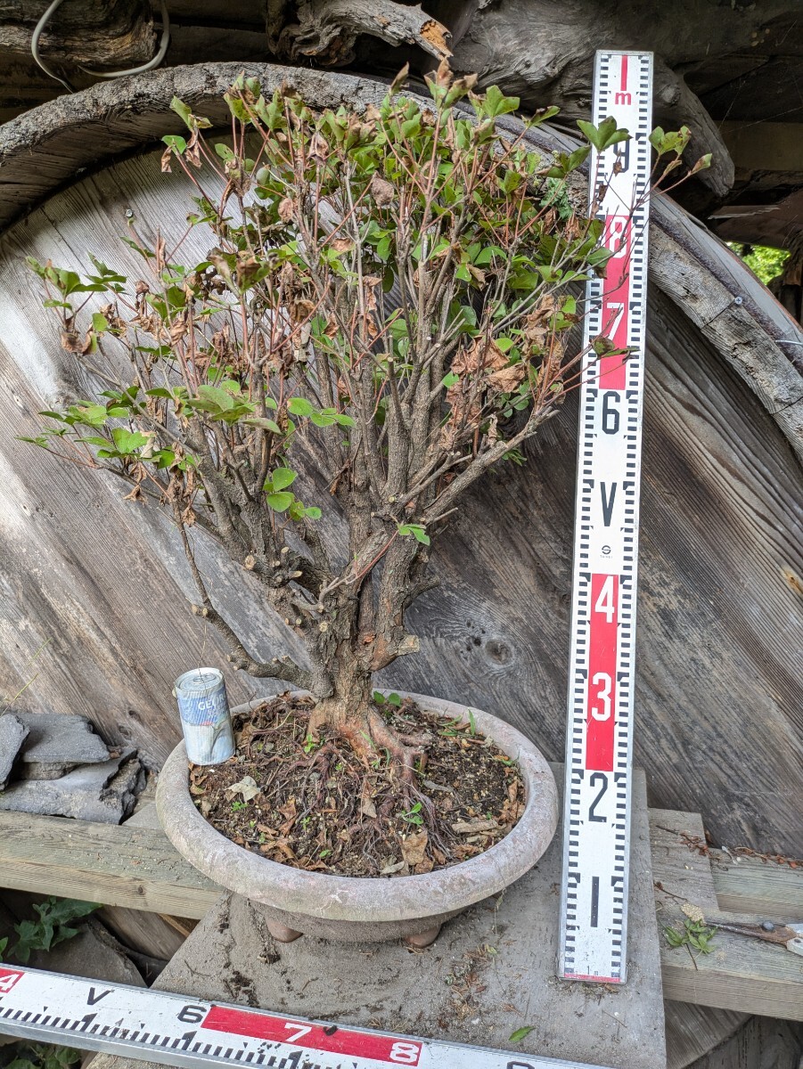 およそは55x55x85cmの枠に入るサイズ。根本付近からの高さは70cmくらい。長年のプラ鉢植えで割れたり老朽してます。今年の葉が落ちたり枯れ枝も有りますが 古木をコンパクトにしてます。発送梱包の際に痛むヶ所が有るかもしれません。佐川急便にて発送する事も有ります。