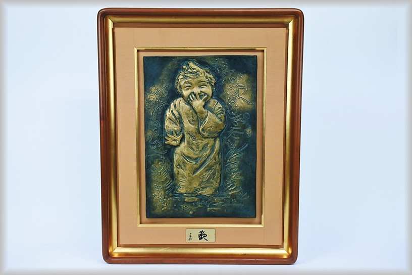 美品 ブロンズ額 レリーフ 北村西望「歓」半立体彫刻 木製額付 パネル 彫刻 オブジェ 文化勲章受章塑像 銅製 喜 少女 壁掛 Seibo Kitamura 收藏