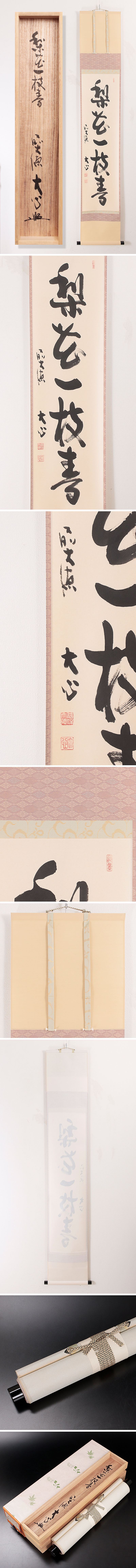 流れるような筆致で書かれた非常に美しい書です。 【梨花一枝春(りかいっしはる)】・・・一枝の梨の花が春の雨に濡れている様子、または美しい女性が涙に濡れている様子を指す言葉です。白居易の「長恨歌」に由来する表現です。 ★商品は小室大心の作品である事を保証致します。 ※掛軸の同梱発送について※ 掛軸とお茶碗などの茶道具との同梱は、破損の危険性が非常に高いため、基本的に承っておりません。予めご了承下さいますようお願い申し上げます。掛軸同士やその他形状が近い商品に関しては同梱可能な場合もございますので、その際は当店よりお知らせ致します。 |