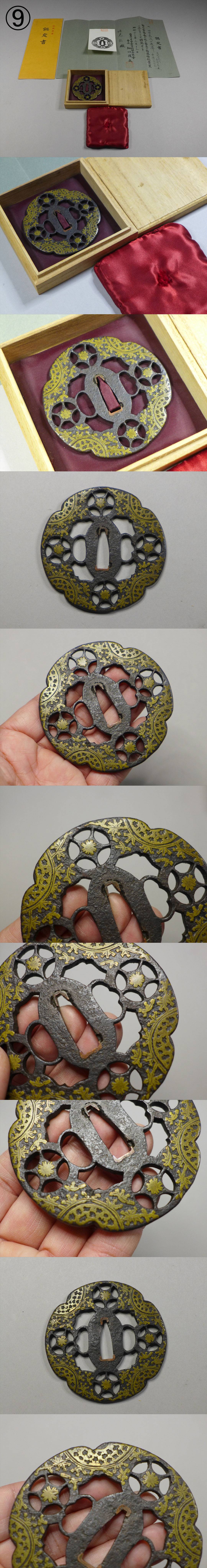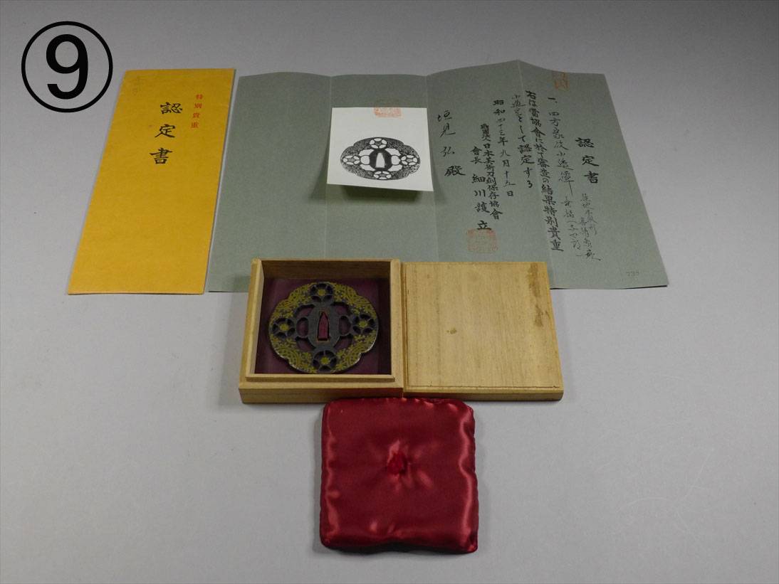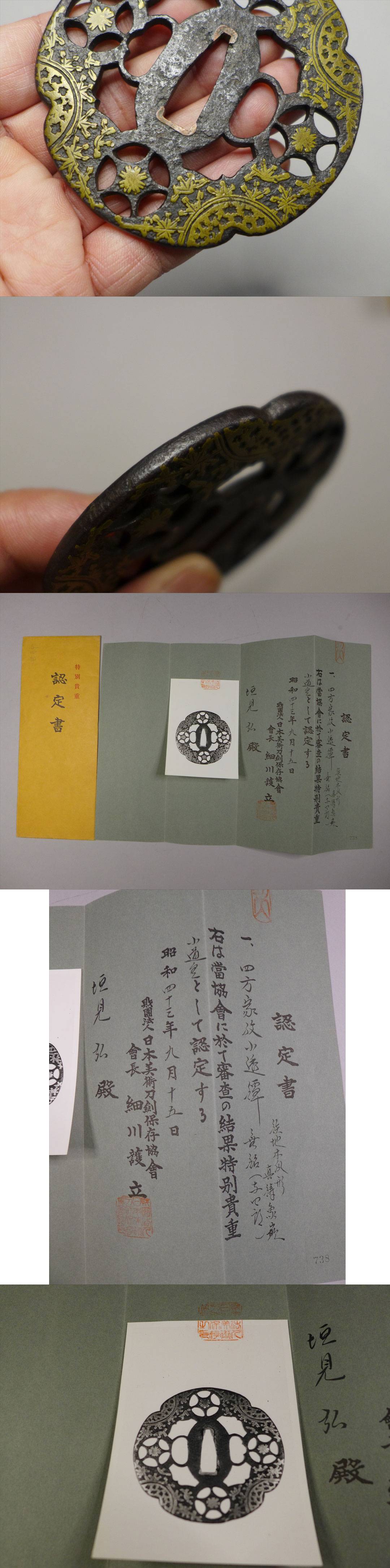 刀装具 鍔⑨ 無銘(与四郎)真鍮象嵌四方家紋小透鍔 鐔 特別貴重認定書付 検/拵え刀剣武具目貫小柄日本刀 收藏