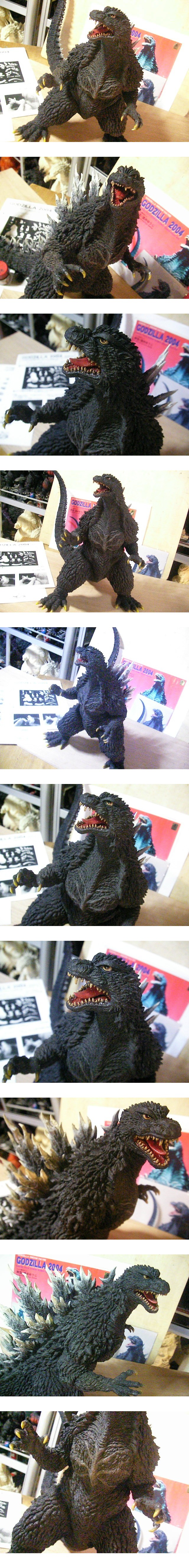 酒井ゆうじ氏原型 レジン 頭までの高さ30cm 鼻先から尻尾まで約47cm 尻尾までの高さ27cm 元箱の背表紙(版権シール添付)・インスト・完成見本写真付き。30cmサイズで名作、傑作、決定版的ゴジラを連発している最近の流れとは違いますがSOSゴジラのほぼ決定版と言える素晴らしいゴジラだと思います。ただ、捻りのあるポーズは不規則な抜け方になりやすいソフビの性質上、敬遠されている(?)ようでエクスプラスのラインナップにもありません。ソフビになれば姉妹キットと言える機龍ゴジラと並べられるのに非常に勿体無い・・・。いや、むしろ、その事がこのSOSゴジラの希少性と価値を高めているという事なのでしょうか。何れにしろ「胸に傷を持つ」ロマン溢れるデザインは現代最高のゴジラ原型師・酒井さんの手によって躍動と俊敏性が加えられて至高の立体物となっています。製作では接着部に心棒を入れて補強しながらパテを盛って埋めていき組み立てました。背ビレの先端、爪などはナイフを入れて鋭利に尖らせてあります。塗装では前作から緑系ではなく青黒くなっているようですので、そう見えるよう暗いグレーに数色段階を分けて複雑な色味にしました。背ビレは芯の部分からトゲ先にかけて徐々に白系統、爪は根元が汚れていて黄土色から黄に近い色を数色掛けて塗装。最後に顔周辺。先ずは口内。資料としている本、数点で確認した所、赤味の強い風味ですので設定に寄せて赤味を強く縁を汚して生物感を付けて塗りました。牙は根元に汚しのある乳白色。最後に目。赤黒いアイラインを入れた後、濁りのある白系統数色で立体感を付けながら瞳は縁に少しだけオレンジでその中に黒目を描き込んであります。目は双方の視線を前方に向けつつ、正面、横顔ともに破綻をしない位置に工夫してあります。レジン完成品での出品は今後もほぼ無いと言えるキットですのでこのご機会をお見逃しなく!よろしくお願いします。