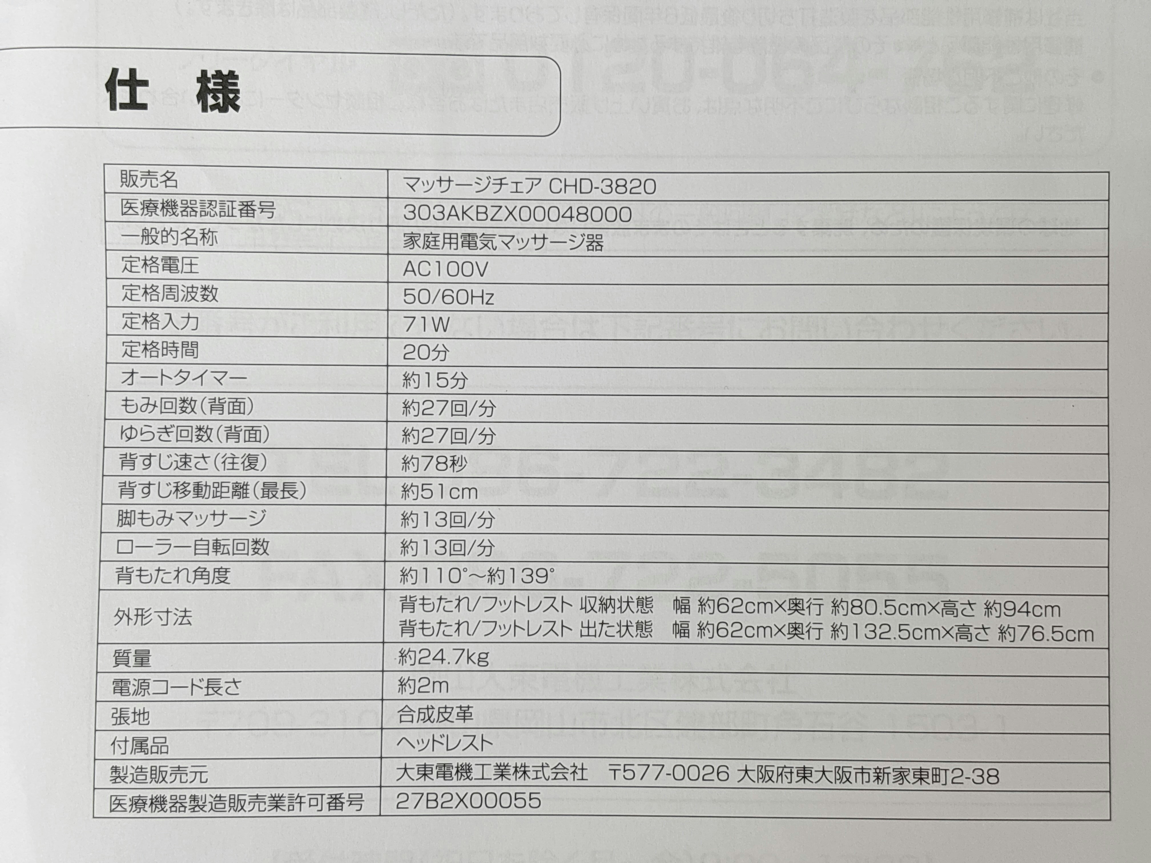 ■メーカー 大東電機工業株式会社 ■ブランド SRIVE ■品名 マッサージチェア ■型番 CHD-3820 ■サイズ(約) 通常時 幅/620mm × 奥行/805mm × 高さ/940mm リクライニング時 幅/620mm × 奥行/1325mm × 高さ/765mm ■重量 24.7kg ■参考価格 99,800円 ■年式 2023