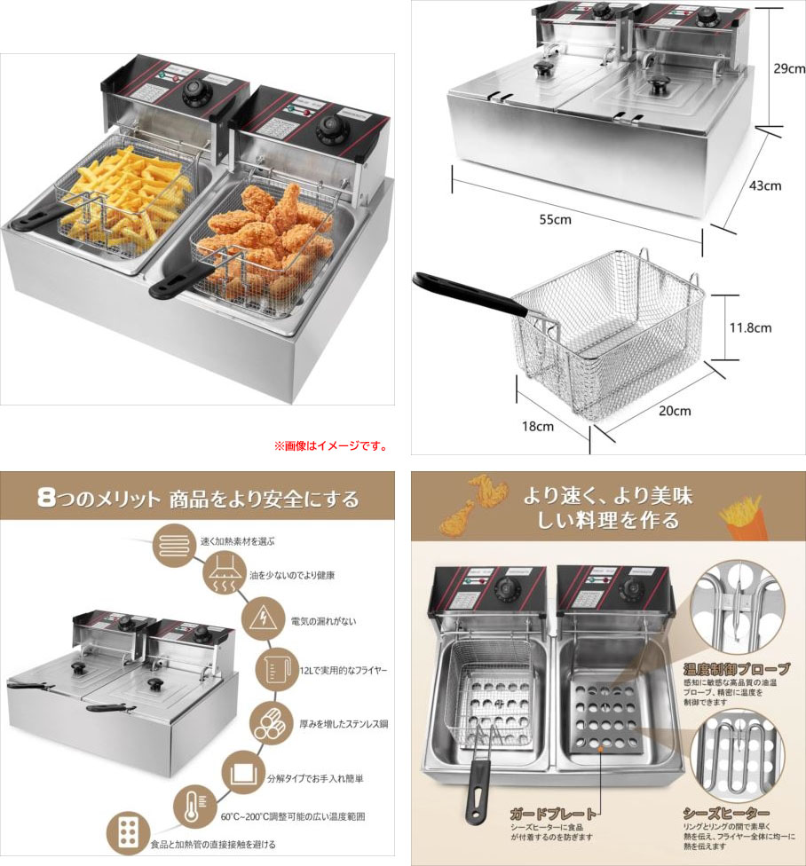 【商品特長】 ●温度ボタンを回します。緑色は電源ライト、赤色は加熱ライトで、一目瞭然です。3本の電源プラグが二つあり、 各炉は個別に通電することができ、2本のプラグと比べて、より安全に使用でき、事故を減らすことができます。 (使用するには、三こ穴のコンセントや変換プラグが必要になりますので、ご了承ください。) ●フライヤーは大容量で、タンク一つは6Lで、12Lあります。二槽式のタンクはそれぞれ個別通電できるので、 異なる食材を同時に調理することができ、食事の効率も上がります。 業務用に特に適合する電気フライヤーです。 ●1.ステンレス鋼のU型加熱管、迅速かつ均一に加熱できます。 2.中空油温度制御プローブは温度制御に使用され、高感度の検知と簡単なコントロールできます。 3.そして、ガードブレートは付属して、シーズヒーターに食品が付着するのを防ぎ、加熱管の寿命を保護できます。 ●温度は60℃~200℃まで自由に選択でき、操作が簡単で高速加熱が可能です。 温度によって、天ぷら、イカ、フライドポテト、フライドチキンなどの揚げ物を作ることができます。 こちらの商品は未使用品です。 外観チェック、通電、ランプ点灯の確認を行いました。 | |||||||||||||