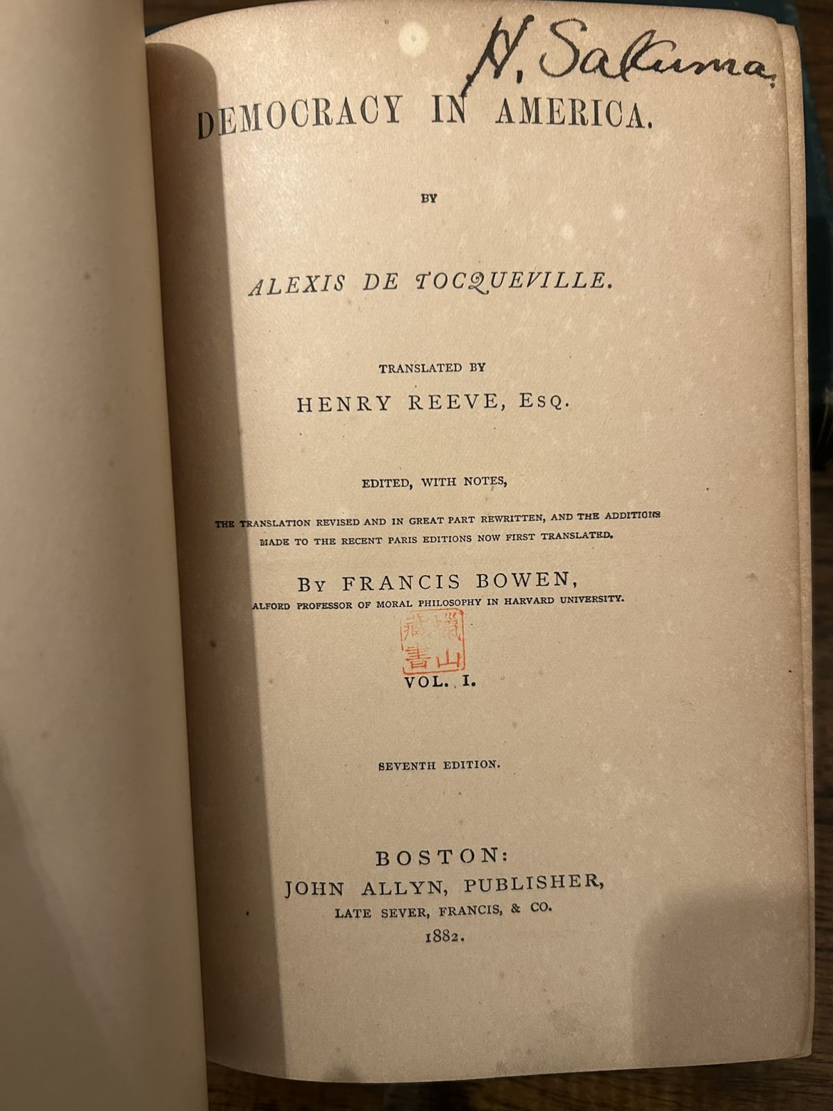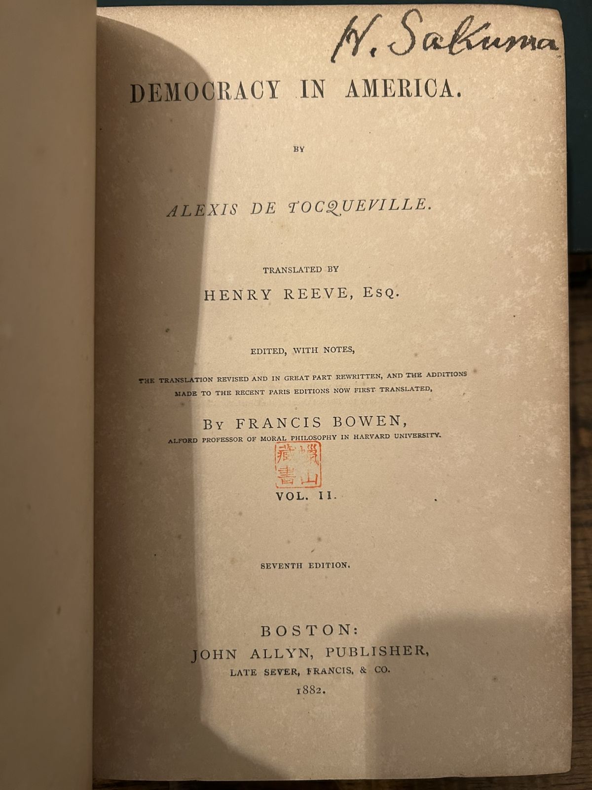 1882年7版 トクヴィル アメリカのデモクラシー TOCQUEVILLE, Alexis De. Democracy in America. 2 Vols. 2巻揃 英文洋書古書 收藏