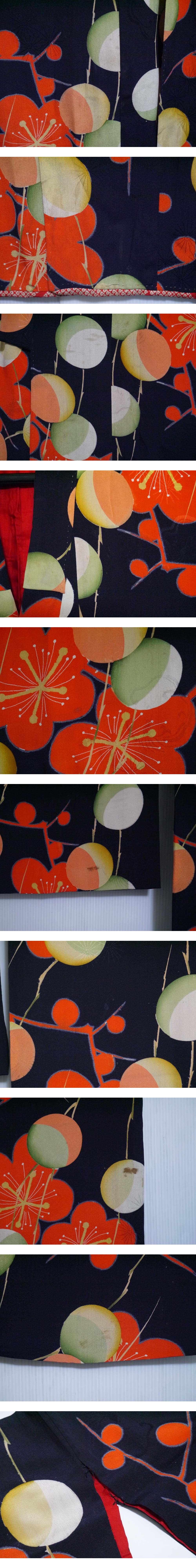 【KIRUKIRU】アンティーク 女の子着物 正絹 錦紗 大正ロマン 黒 梅の花と水玉ボール 地紋 レトロ 古布 古裂 リメイク 材料 生地 手芸 收藏