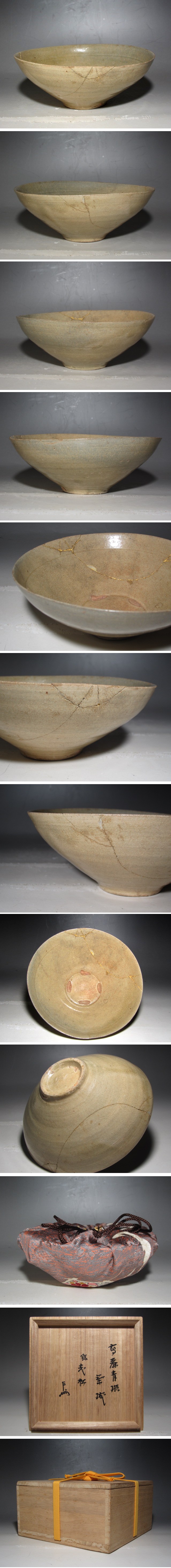 時代ある高麗青磁茶碗「老松」です。 味わい深い景色で、時代を感じられる見事で貴重なお品です。 箱蓋裏に表千家十三世即中斎の花押があります。 サイズ 直径17cm/高さ6.5cm(多少の誤差はお許しください) 状態 金直しが施されています。 骨董品という事をご勘案頂き、時代経過のスレや、小さな傷がある場合があるかもしれませんのでご承知置きください。 | |||