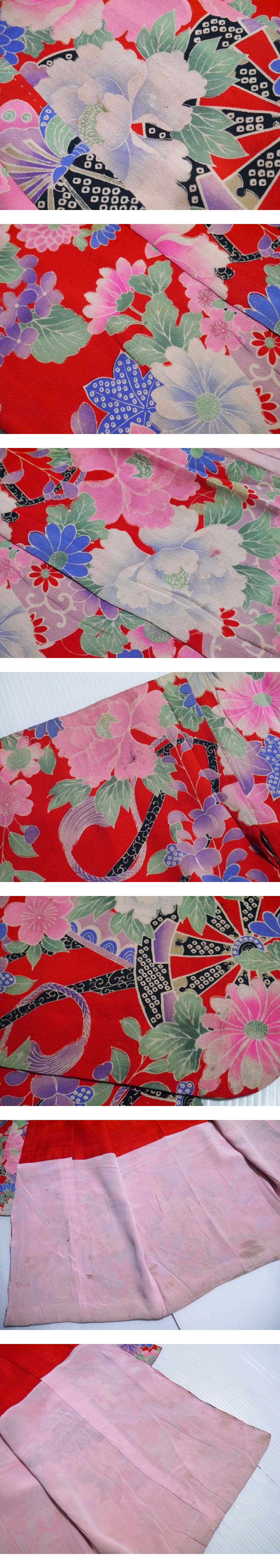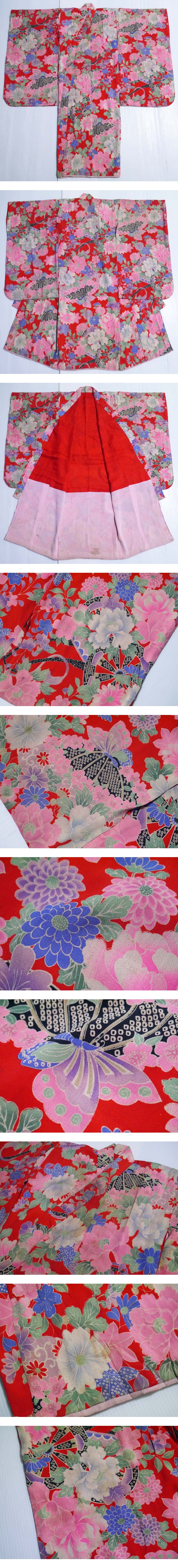 【KIRUKIRU】アンティーク 子供着物 一つ身 正絹 錦紗 大正ロマン 赤地 四季の花 蝶 花車 花笠 古布 古裂 リメイク 材料 生地 人形細工 收藏