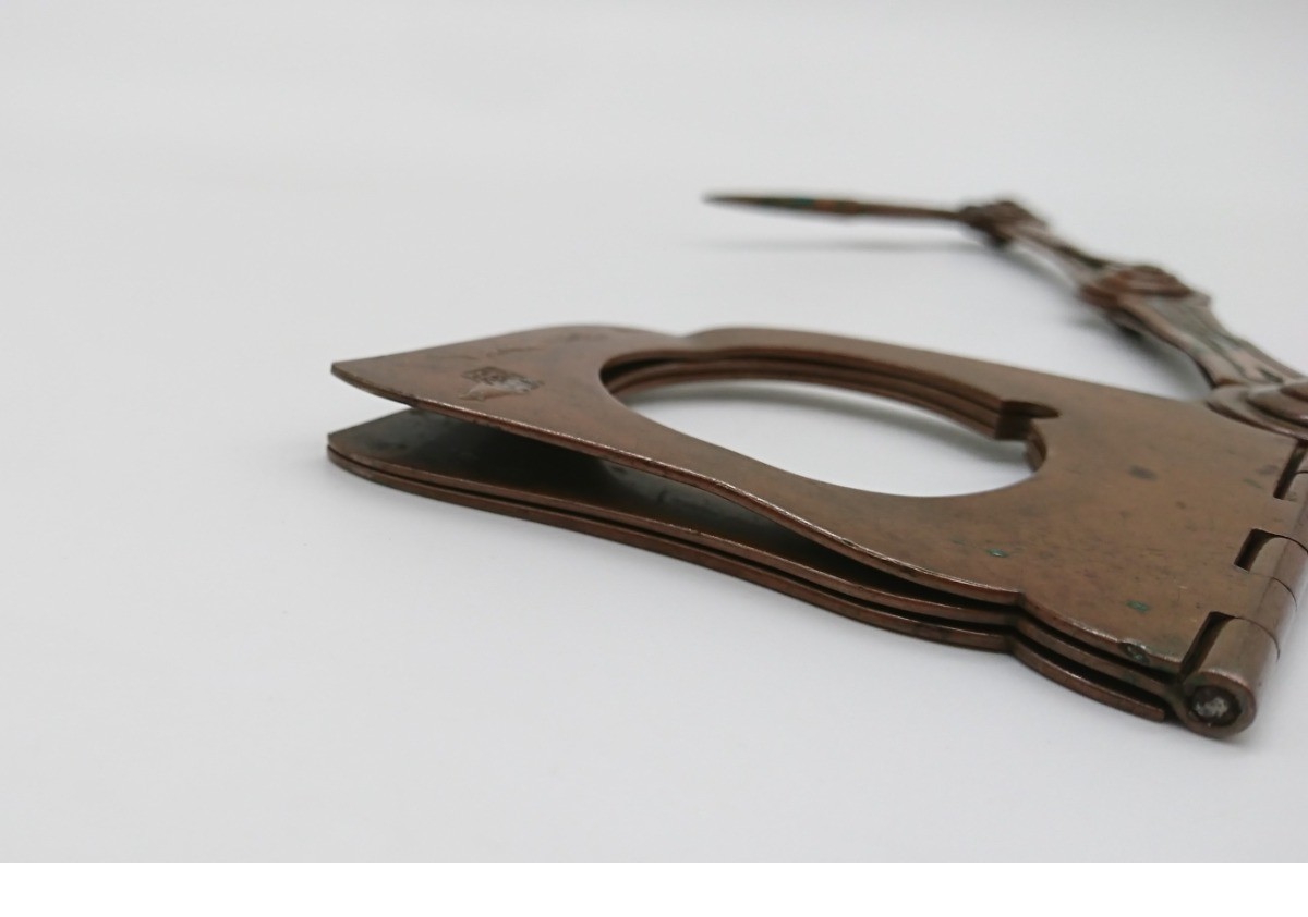 江戸時代末期に天才発明家・田中久重(東芝の創業者)が考案した携帯用のロウソク立てで、コンパクトに折りたためて懐に収まるのが特徴です。