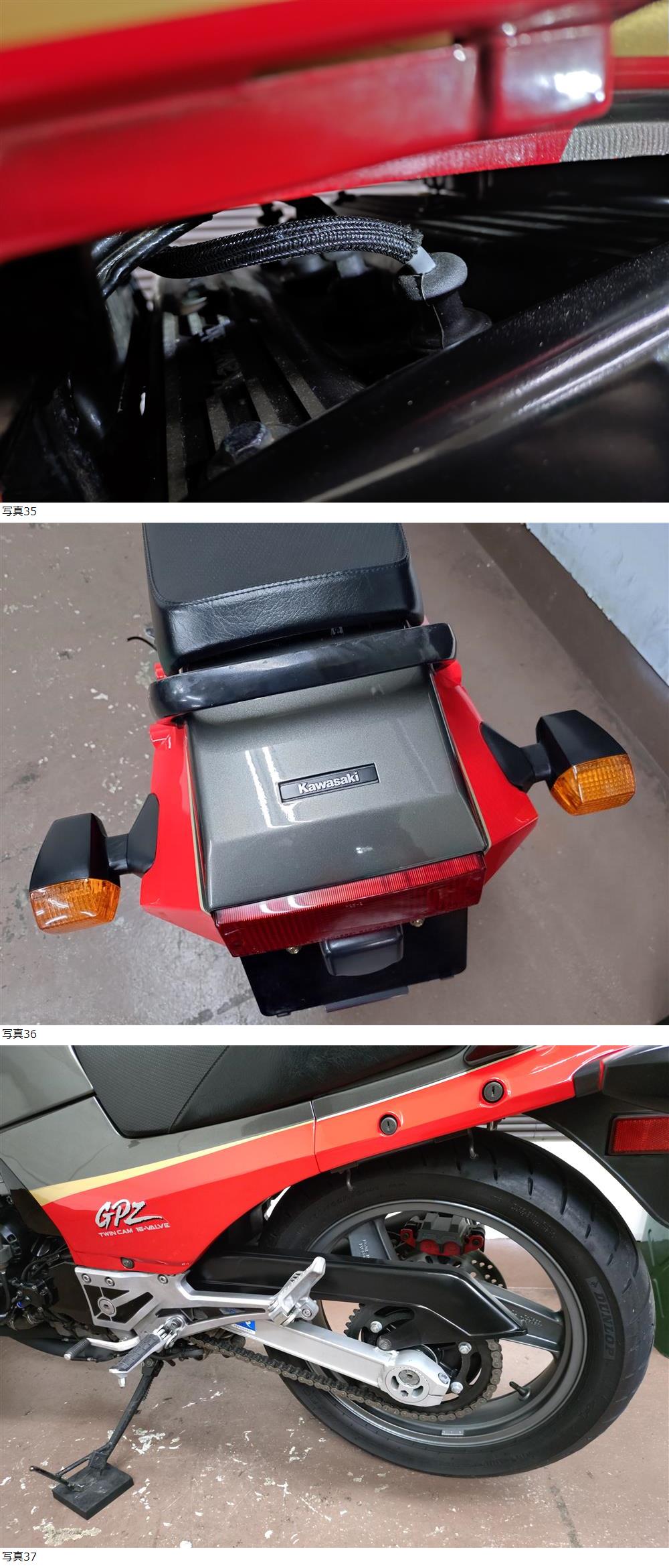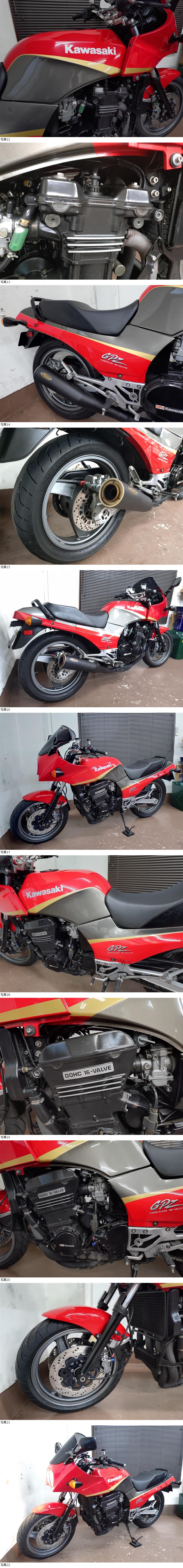 | 商品説明 | ★☆出品車両の拡大画像は文末に掲載しております★☆ アクセス頂き有難うございます。 商品説明文を最後までご熟読頂き、オークションへのご参加およびお取引を、宜しくお願い申し上げます。 -------------------- ●車両基本情報 ・初年度登録年月:平成10年1月 ・型式:ZX900A (排ガス規制無しモデル) 【ZX900A-078番台=A11モデル】 『真のA11逆車マレーシア・フルパワーモデル』 ※カワサキHPより上記内容確認済み※ ・車台番号:ZX900A-078***(下3桁伏字) ・メーター表示距離:23,453km(実走行距離) 過去記載距離 19,500km/令和5年 14,700㎞/令和3年 ・キー:純正共通1本+社外スペア1本 ・エンジン始動:○ ・セルまたはキックスタート:○ ・バッテリー残量:○ ●【当方にて『走行テスト』実施済み】 ⇒正常制動・正常ミッション入力ほか確認済み ●保安部品の作動状態 ・ヘッドライトHI/LOW切替:○ ・ウインカー:○ ・ホーン:○ ・テールランプ:○ ・ブレーキランプ前後:○ ●ガソリンタンク内部の状態:目立つような内部サビは特に無し ●エンジンの状態 ・エンジン総合状態:年式/距離相応の状況 (特に大きな問題の無い一般中古車レベル) ⇒気になる際は必ず『現車確認』をお願い致します。 ・オイル漏れ箇所:- ・その他特記事項:顕著なオイル漏れ箇所は特に無し ●足回りの状態 ・ステムベアリングの状態:現状は問題なし ・フロントフォーク:現状オイル漏れ無し/ダストシールひび左右小程度 ・前後タイヤ残量:F 7分山 R 6分山 ●外装の状態 ・ガソリンタンク凹み:目立つような凹み箇所は特に無し 『タンク含め珍しく外観とても綺麗です!!』 ・外観全体:基本的に年式相応とお考えください (多数の画像や始動確認動画の通りの一般的な実動中古車です) 外装A15またはA16ファイナル純正品一式 (珍しく塗り替え無し!) エンジンペイント剥がれ小程度確認 スクリーン薄いキズ小程度あり ドライブチェーン小程度のサビ確認 ~機関/外観の総合的所見は『上物または程度良好』となります~ ⇒①より詳細把握のための現車確認(※諸条件あり・下記参照※)につきましては、質問欄より打診をお願い申し上げます。 ●その他特記事項: 車検は令和9年3月まで残あり 修復歴無し(JABA管理システム上および当方現車確認による) ●お渡しする書類:あり (自動車検査証+自賠責保険証+譲渡証明書+ナンバープレート) ●その他情報 稀に見る『上物』と認識している、【GPZ900R(A11)逆車マレーシアモデル】が入荷しました。 当方、当該GPZ900R(俗称:ニンジャ)を取り扱うことが多くありますが、当車体は多く数のある当車種の中でも、かなりの上物と断言出来る程度良好車と認識しております。 単なる《見てくれ》だけでは無く、フレームほか金属部のサビ箇所も少なく、きちんと継続メンテナンスが施されている様子が伺える、近年では珍しい900Rという感想です。 下記内容の通り、必要最低限の一部メンテナンスメニューは設けておりますが、当車両につきましては『本当に軽い乗車前点検、または軽いメンテナンス程度で直ぐにご乗車可能な(900R)』と断言出来る車体です。 +かつ、当GPZ900Rオーナー様には当たり前の情報ですが、A8以降モデル(=詳細は避けますが、ニンジャ系エンジンのウイークポイントを改善)のA11モデル、更には真のマレーシア仕様車(所謂『逆車フルパワー』)となりますので、将来的なことを考えた際、このあたりのモデル選択がやはり良いと考えられます。 加えて多数の画像および、上記内容となりますので【車体的には『一生物』】と捉えて差し支えないもの】と、当方は認識しております。 以上を含め、ぜひこの機会にご検討くださいませ。 車検は令和9年3月まで残がございます。 また、走行距離区分の減算や改ざん履歴は一切ございません。 上記、情報追記しておきます。 その他、カスタム箇所は画像で判断可能なものとなります。 マフラーは定評のノジマ製4-1メガフォン(車検受験は当マフラーで大丈夫です)が装着されております。 また、定番バーハン化がなされておりますので、ポジションも割と楽かと考えます。 +画像の二輪車専用ETC(2.0システム)は、そのまま装備した状態での車体お引き渡しとなりますので、どうぞ宜しくお願いします。 車検付き車両にて、近所での軽い試乗の際は、細かな部分を除き、《走る/曲がる/止まる》という走行に関する基本的動作につきましては、特段大きな不具合は現状、感じられませんでした。 但し、わずかな距離での確認です。 未整備現状渡しですので、落札者様にて乗車前点検を必ず行ってからの走行をお願いします。 -------------------- 【下取ご相談大歓迎です】 『現車確認時に、当方事業所まで下取対象車両のお持ち込みに限り』、当方による実車査定にて下取(=厳密には『査定買取』)対応可能です。 -------------------- 【別途オプション】 ①エンジンオイル交換 《当該車種の銘柄=ワコーズAA 15W-40です》 金額=10,000円(ドレンワッシャ新品含む) となります。 ②新品プラグ交換(NGK製) 金額=8,800円/4