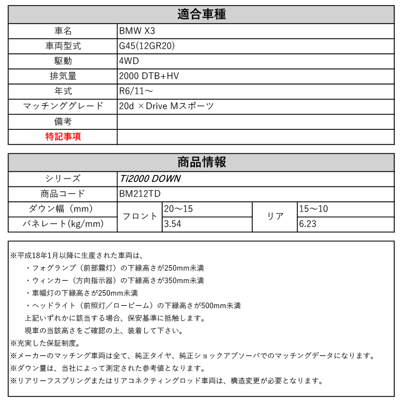 [RS-R_Ti2000 DOWN]12GR20(G45) BMW X3_20d ×Drive Mスポーツ(4WD_2000 DTB+HV_R6/11~)用車検対応ダウンサス[BM212TD] 收藏