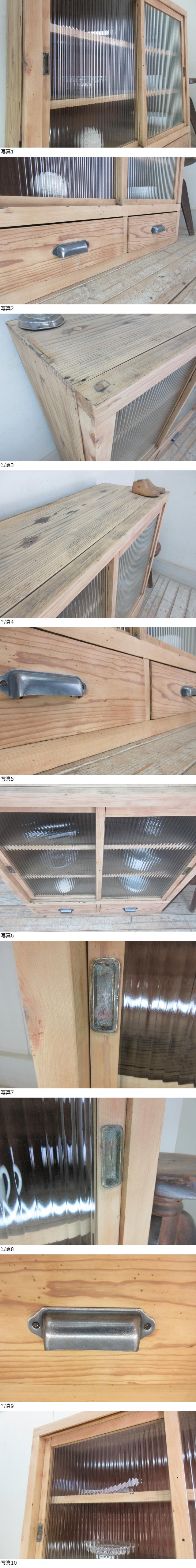 古い木味モールガラスの2杯引き出し収納棚G145 アンティーク家具陳列棚食器棚卓上水屋箪笥店舗什器カフェ什器無垢材古家具 收藏