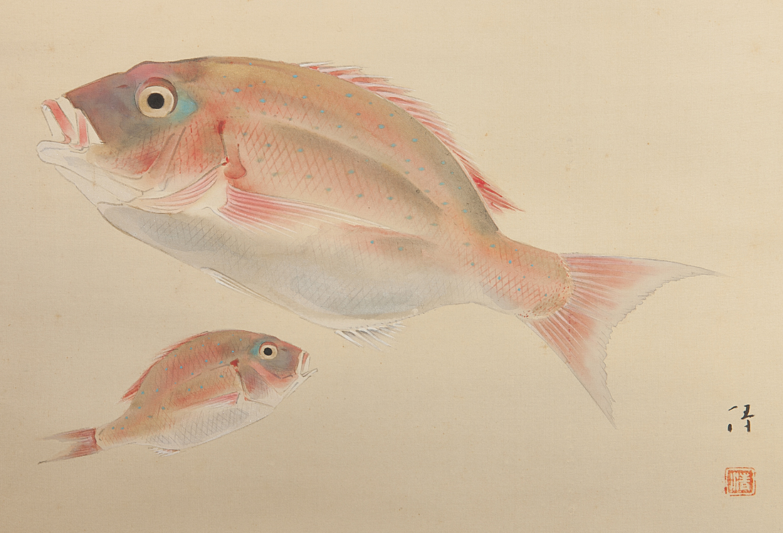 【五】小早川清 『鯛』 絹本 彩色 掛軸 伊東深水識箱 真作 ■ 師:鏑木清方 收藏