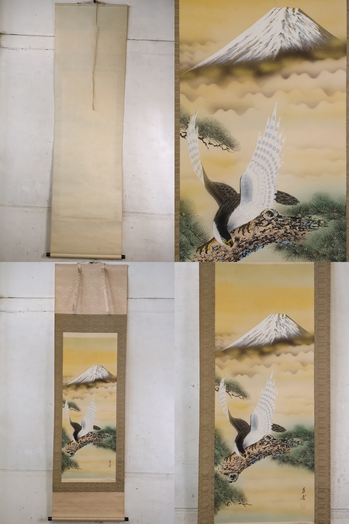 TB526紫雲 富士鷹図 掛軸 絹本 共箱◇落款有/松/縁起物/吉祥/正月/色絵/床掛/掛物/掛飾/日本画/工芸/時代/骨董/古美術/古道具タグボート 收藏