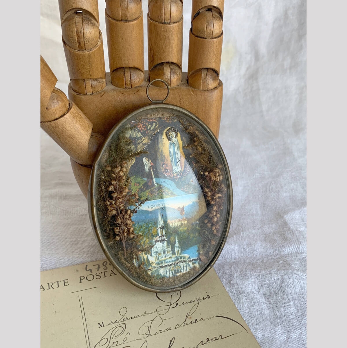 フランス 1940s Lourdes ルルド ガラス ドーム オーバル フレーム ドライフラワー マリア イエス メダイ ロザリオ クロス アンティーク 收藏