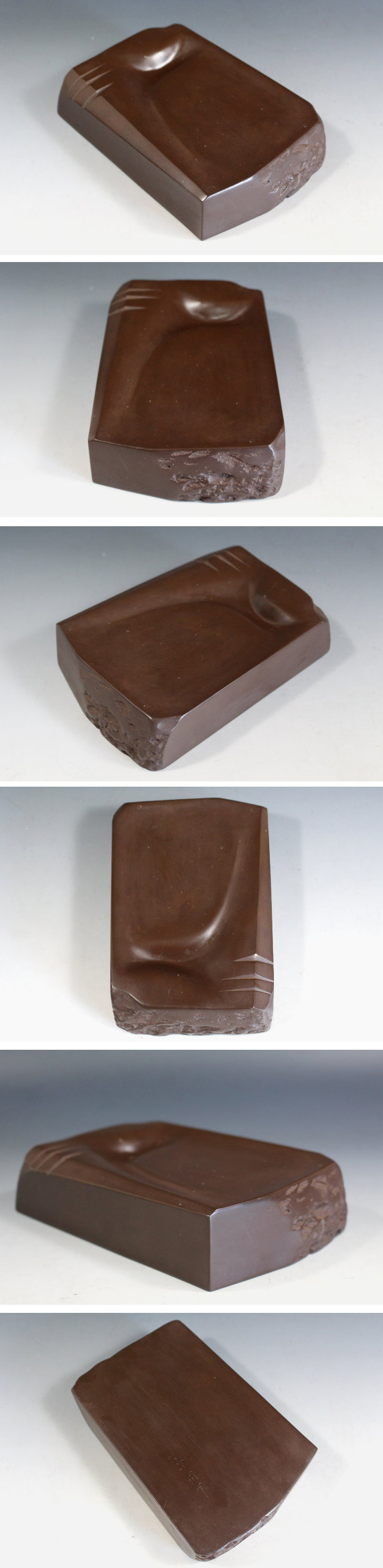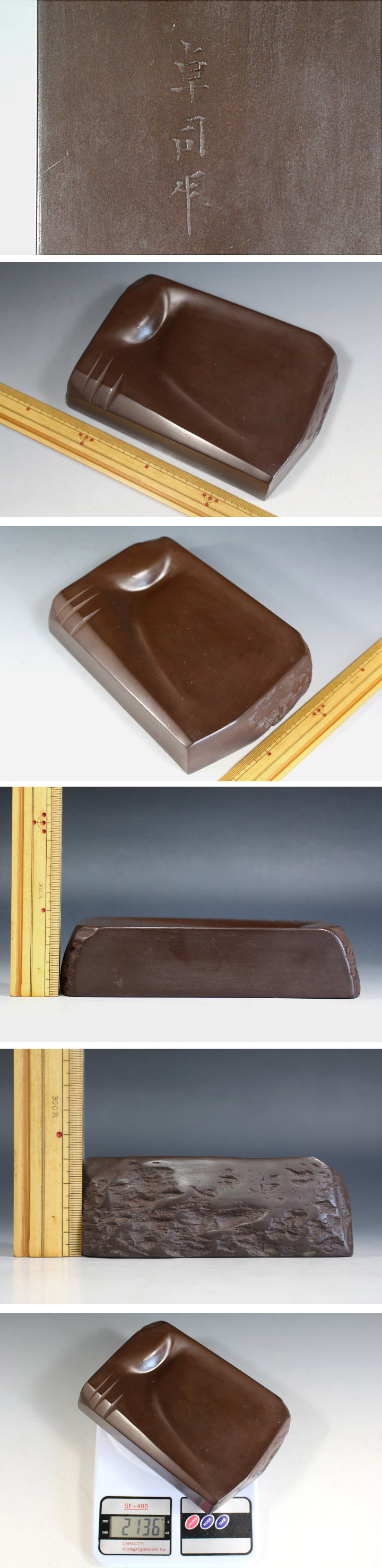サイズ:18.3×11.8×4.1cm 戦後の 赤間硯制作の第一人者/堀尾卓司氏の硯です。 厚さが4.1cm、あまり見かけることがない厚さだと思います。 重量は2136g あり 安定して使用できます。 目立つ大きな傷みはありません。 残念ですが箱がありません。 写真をご覧の上ご入札宜しくお願い致します。 最後の写真は同時出品の硯です。 | |