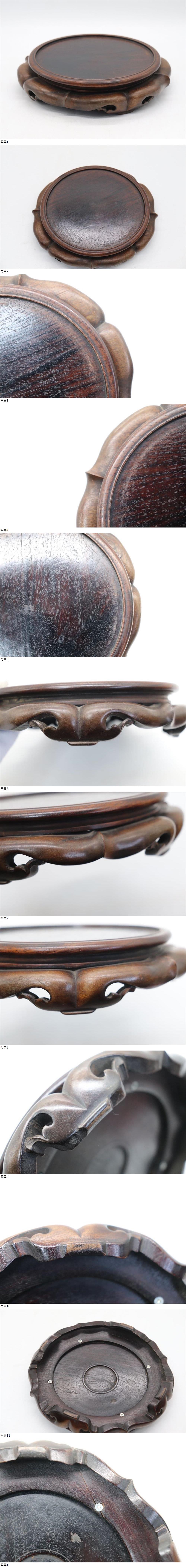 Features: 圓形盤面,邊雕飾花卉紋樣,底座帶有鏤空花紋,整體呈深紅褐色,工藝精緻。