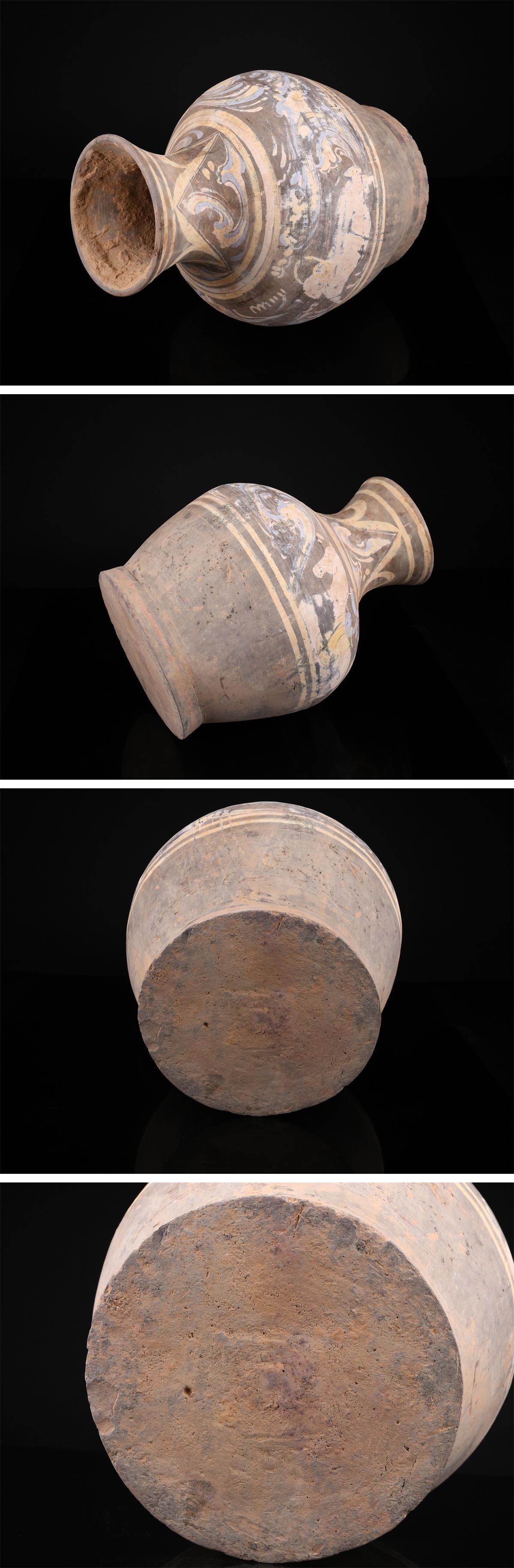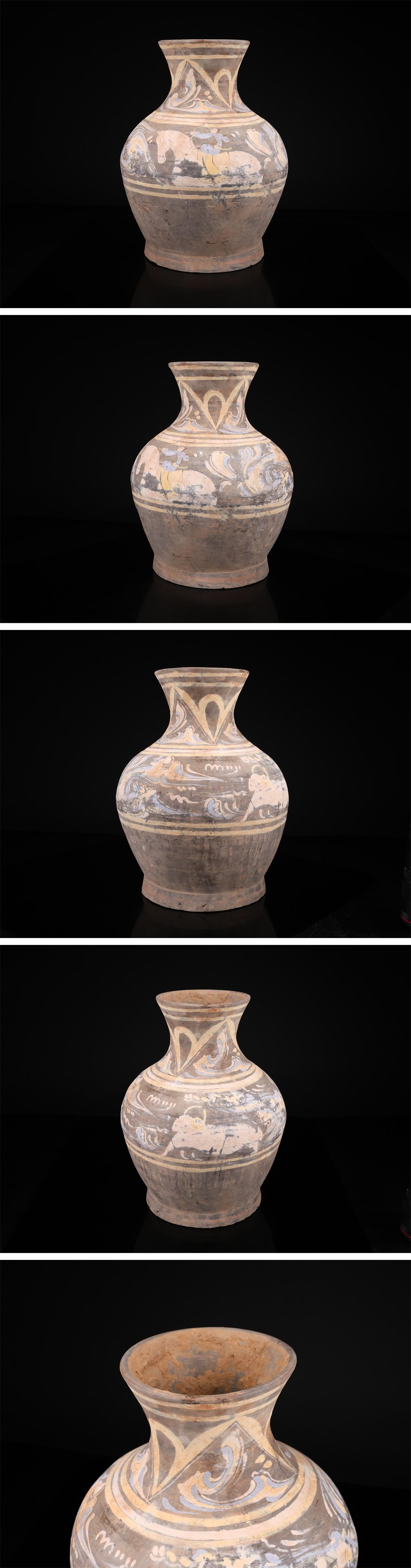 【吉】CR017 唐物 【漢代】 黒陶加彩 馬に人物紋 大壺 大花瓶 高38.5㎝/本物保証I! 收藏