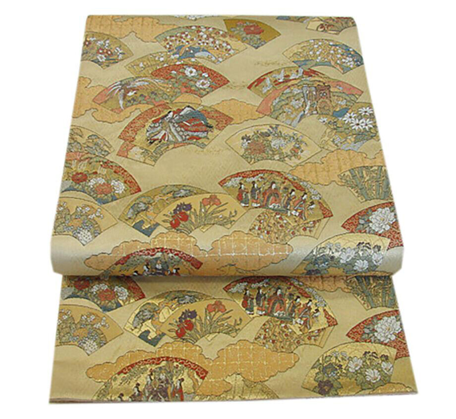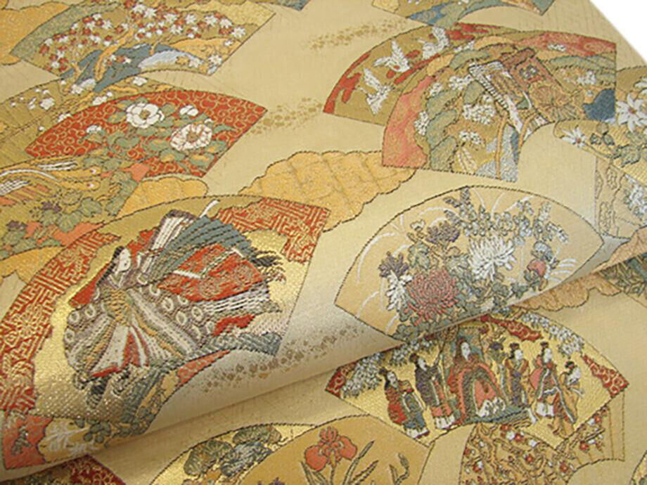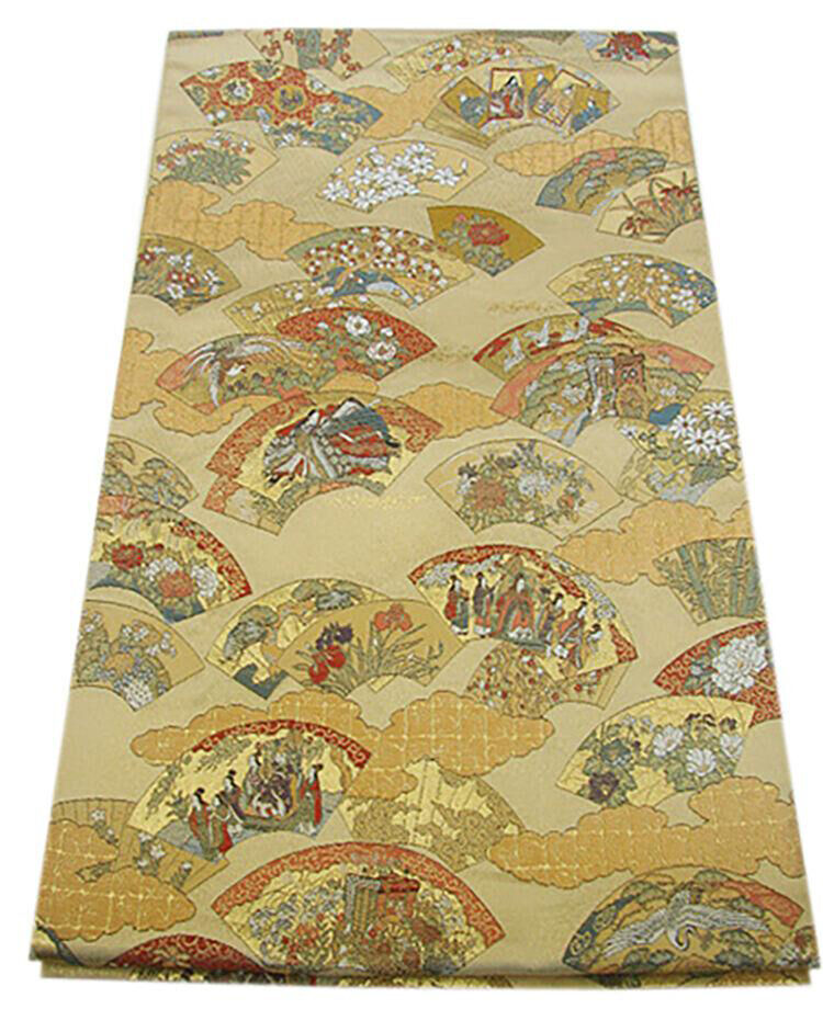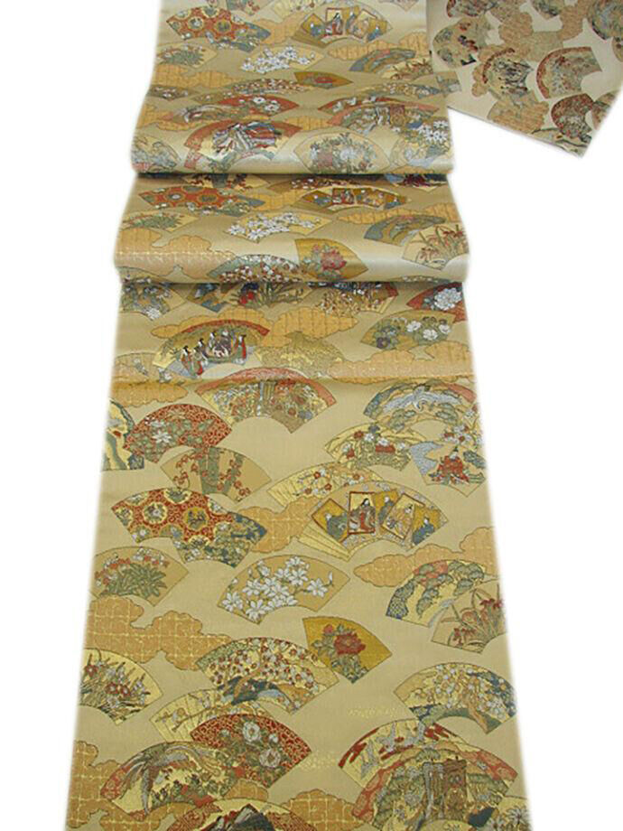 | 商品説明 | しなやかな手触り良い〆易く扱い易い重厚感溢れる西陣織の袋帯。 ベージュ色地に豪華な金糸等の地紙文に御所車や花鳥、平安柄等の織柄。 六通柄。 |