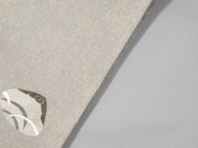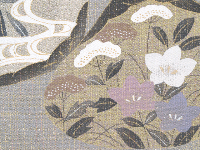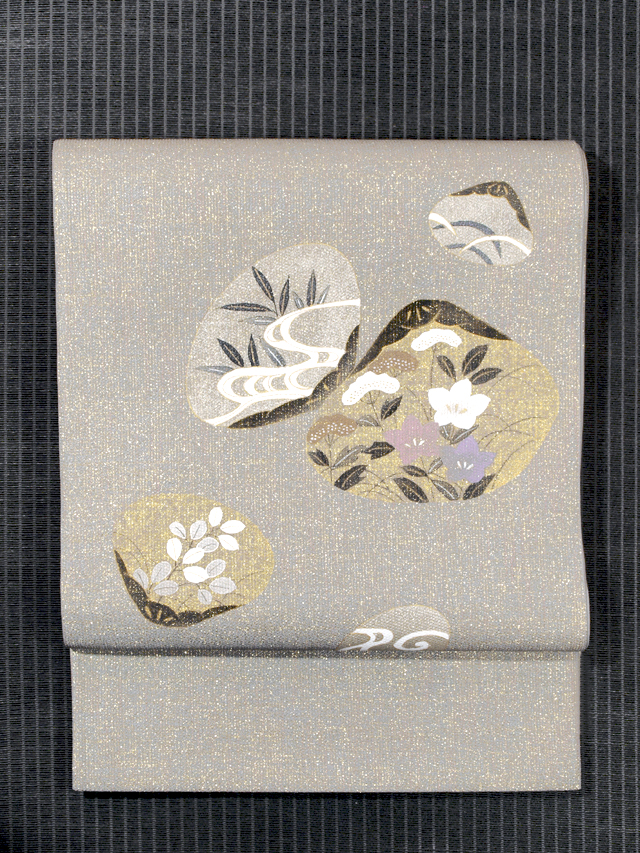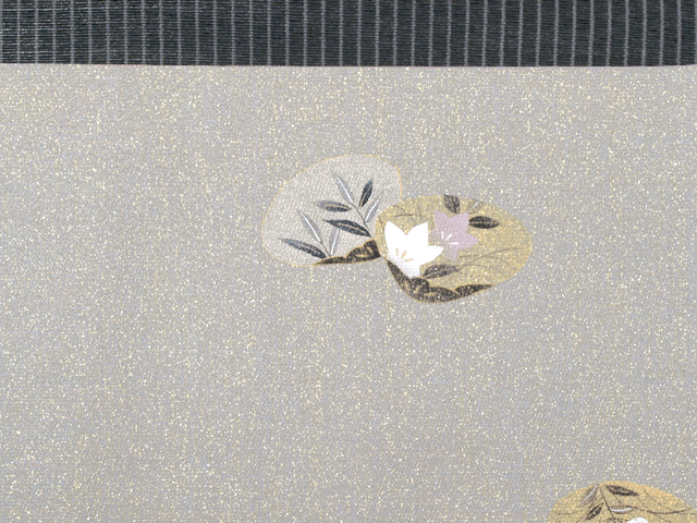 全体的な印象としては錫(すず)色といった感じの地に、薄金色、紅色、濃鼠(こいねず)色、薄緑色のグラデーションになっている箔糸でたて縞の地紋が織り込まれ、貝合わせの文様が手描きで友禅染めされている西陣織の袋帯です。日本画から着物の世界に入った作家の高橋翠延氏のお作で、たれ上のお太鼓で隠れる部分に落款が入っています。 貝に配された草花は、どこか愛らしい風情を持って描かれていて、人形絵師出身の高橋氏ならではの高い表現力を感じさせます。品よく繊細な感じのする極細の地紋の箔糸が、光の加減でラメのようにきらめきます ユーズド品としてはいますが、使用感はほとんど感じられません。前の折り跡がごくわずかにある感じも足ますが、判別はつかず、試着程度と思われます。そのほかに目につくしみやよごれ、褪色などのダメージはなく、ほぼ新品同様にきれいな状態です。 |