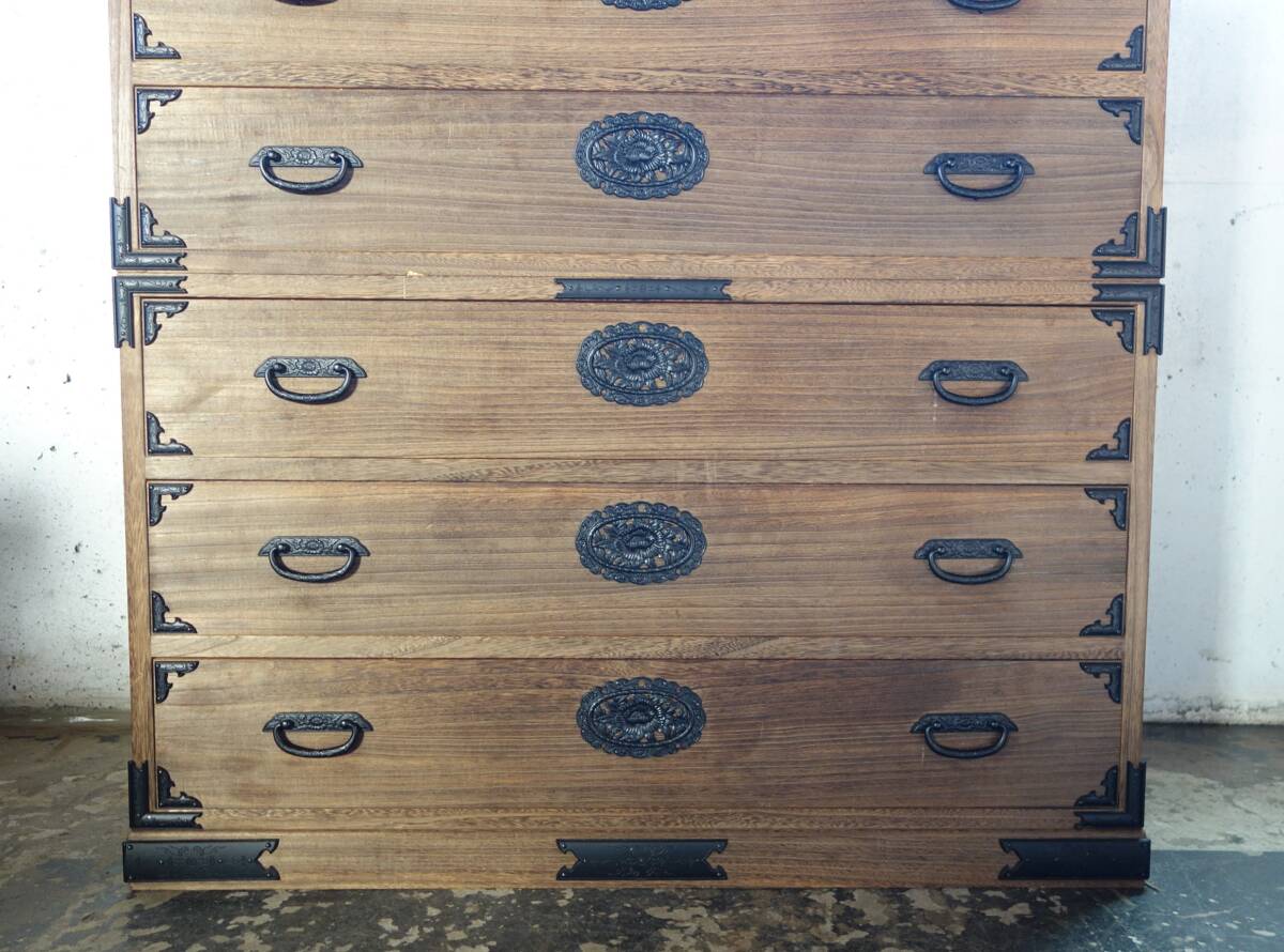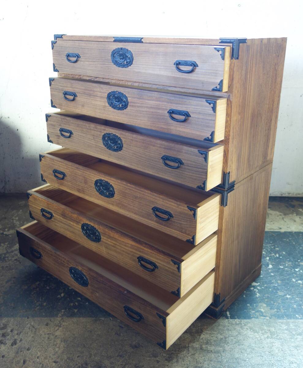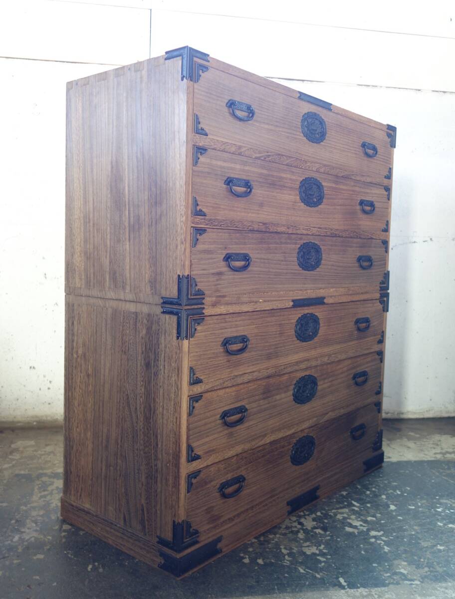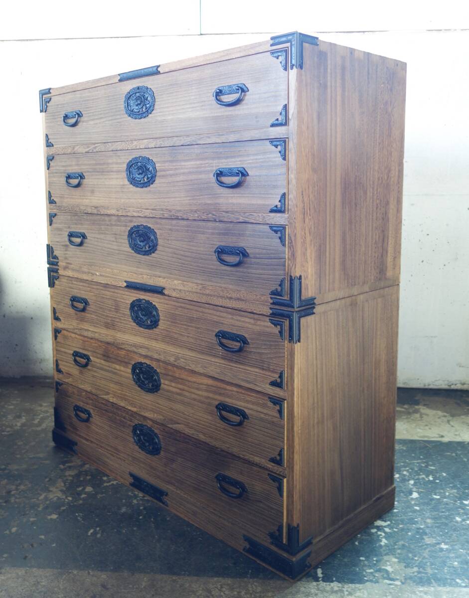 *伝統工芸 工芸美術 レトロ 高級和家具 箪笥 *日本製 生産地 岩手県 *桐箪笥 重箪笥 二段六杯 桐天然木 本焼みがき仕上 *花唐草 牡丹花文 金具黒色 *EY-530 1407-3 *鍵と転倒防止金具 付属 *丸石商事株式会社謹製 |