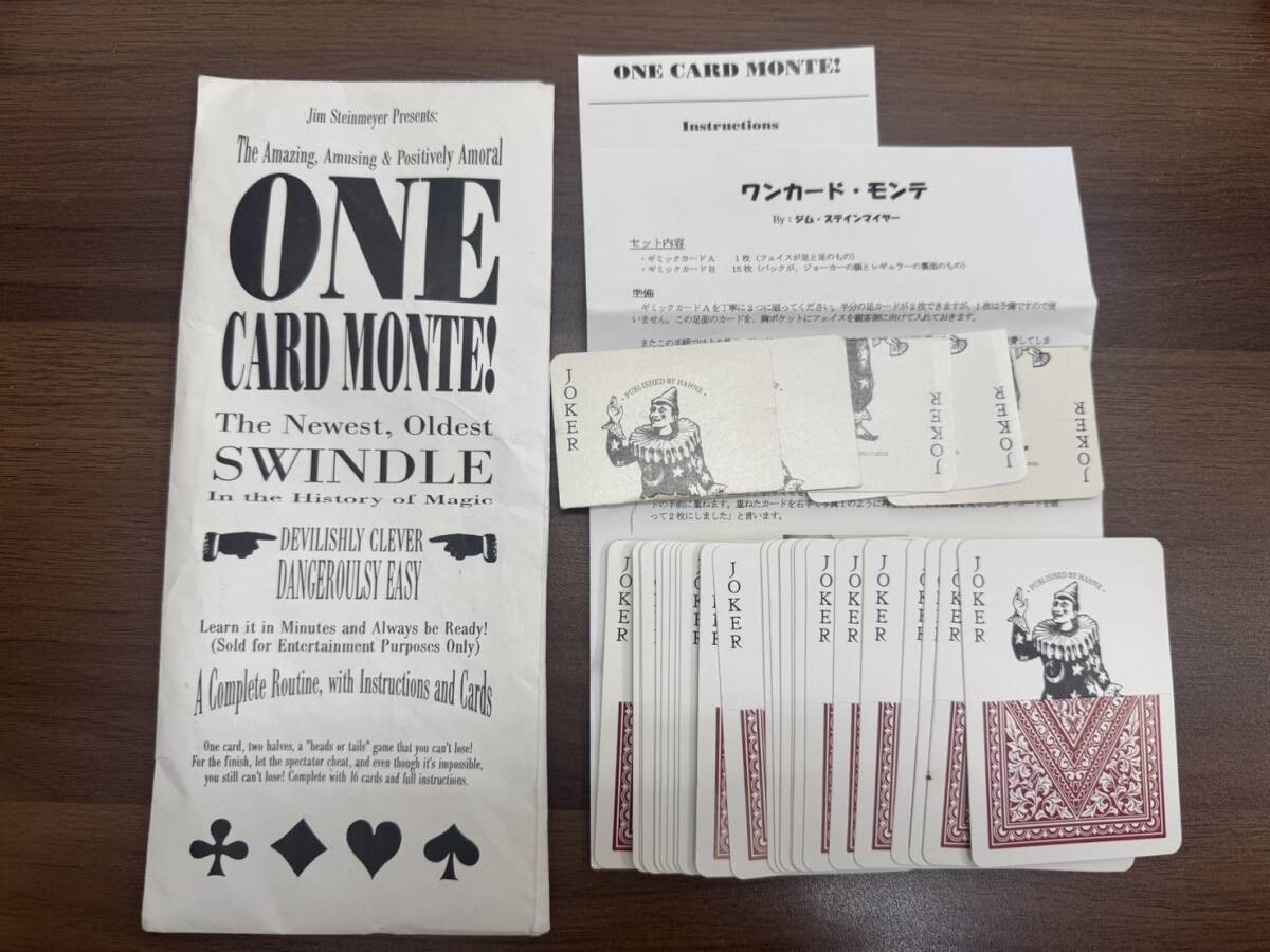 特別に印刷されたジョーカーを使った、他の古典的なルーティンのバリエーションである、驚異的なモンテルーティンです。パフォーマーはジョーカーを半分に引き裂き、「表」と「裏」を作ります。そして片方の半分を取り出し、手の中に隠します。観客は推測しますが、必ず間違っています。最後に、半分のジョーカーはマジシャンの手の中で反転します。これは、このシンプルなゲームを騙す、驚きの魔法のような方法を実演しています。カードは独自の印刷が施され、完璧な効果を生み出すように作られています。パフォーマンスごとに1枚のカードを破ります。