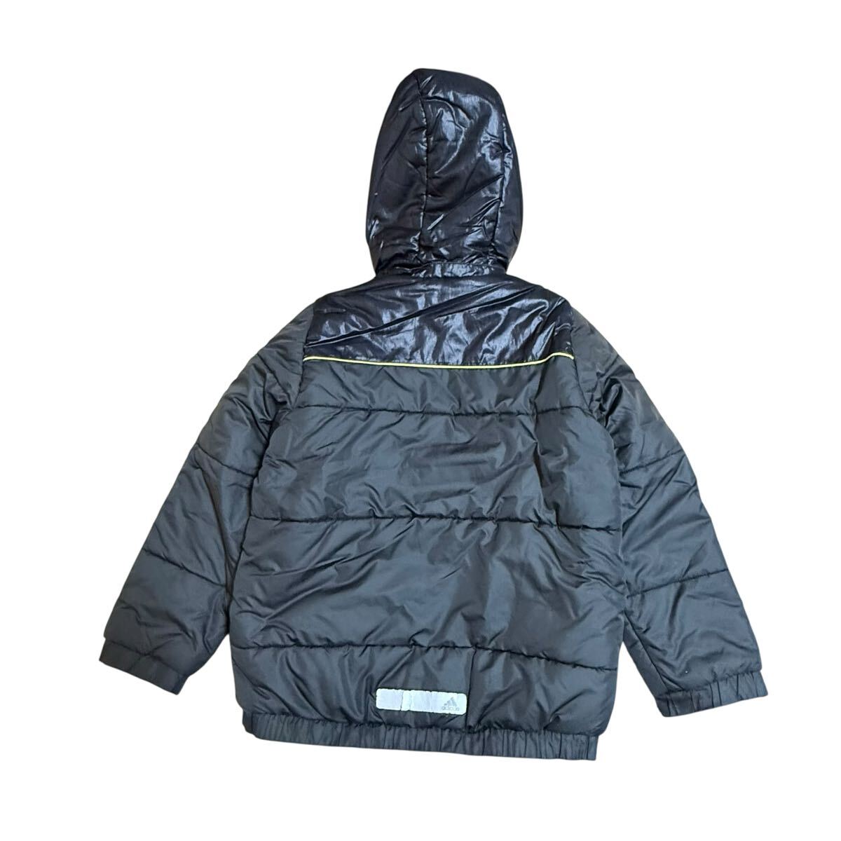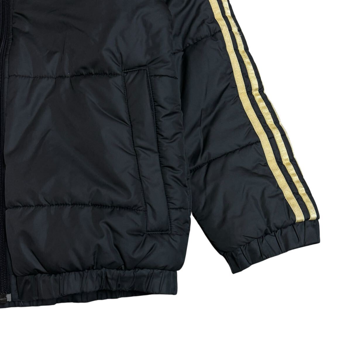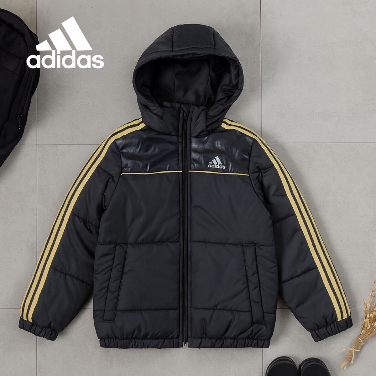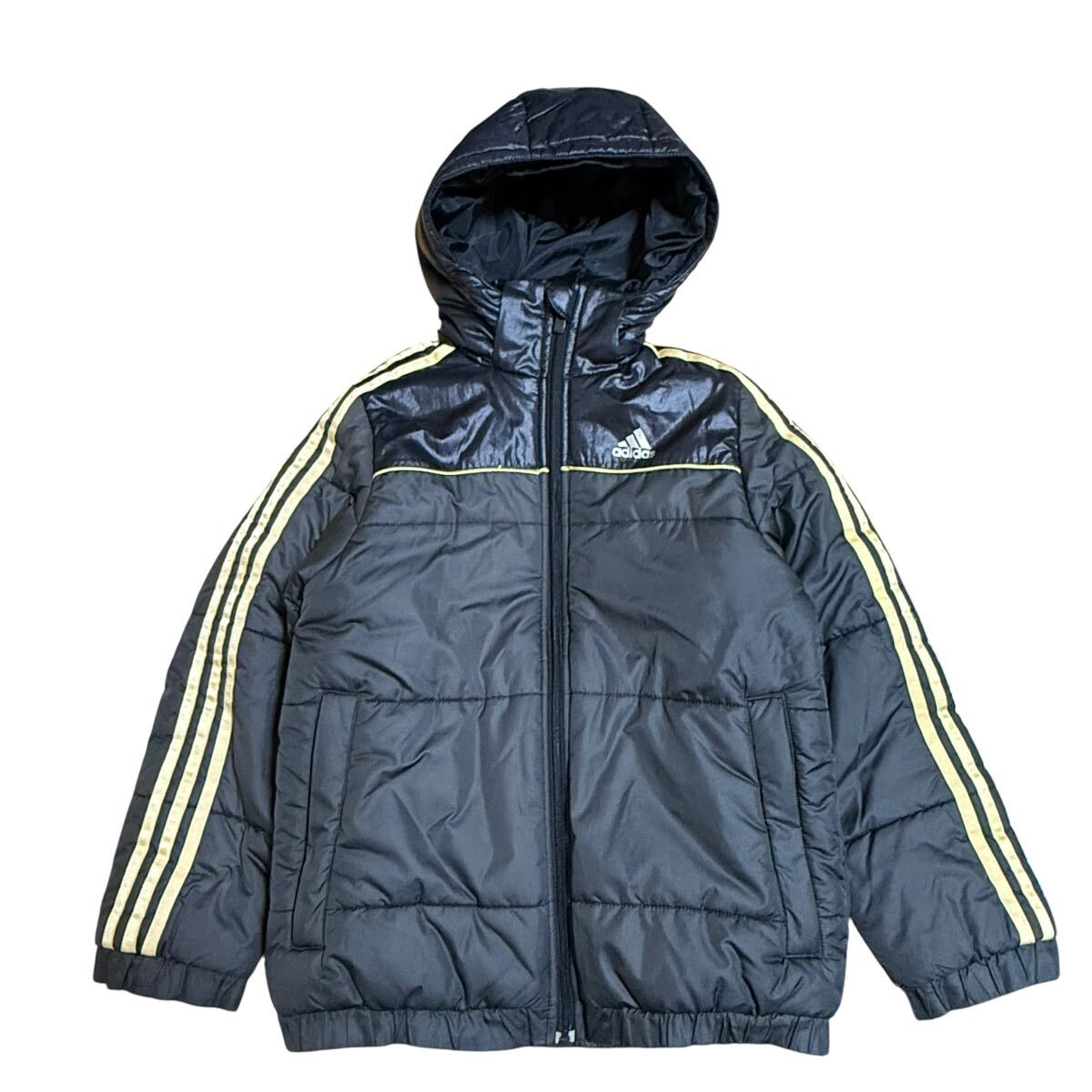 アディダスのキッズ用中綿ジャケット。軽量で暖かく、フード付きで防寒性も抜群。通学やお出かけに最適です。