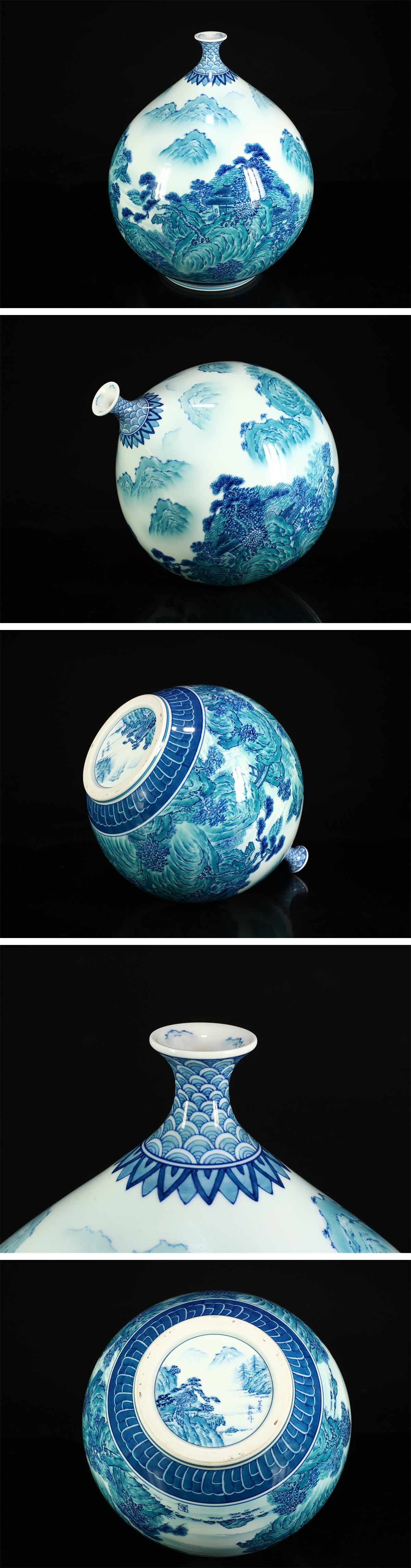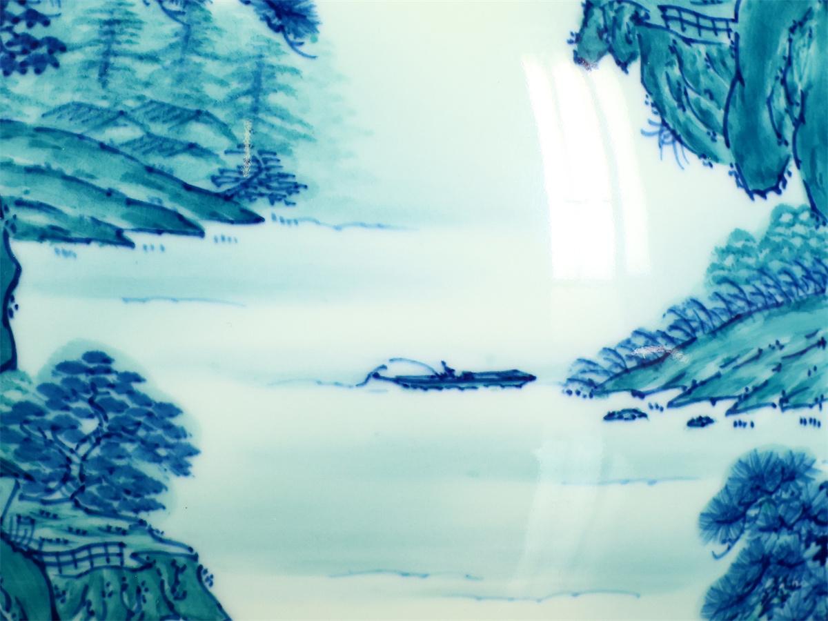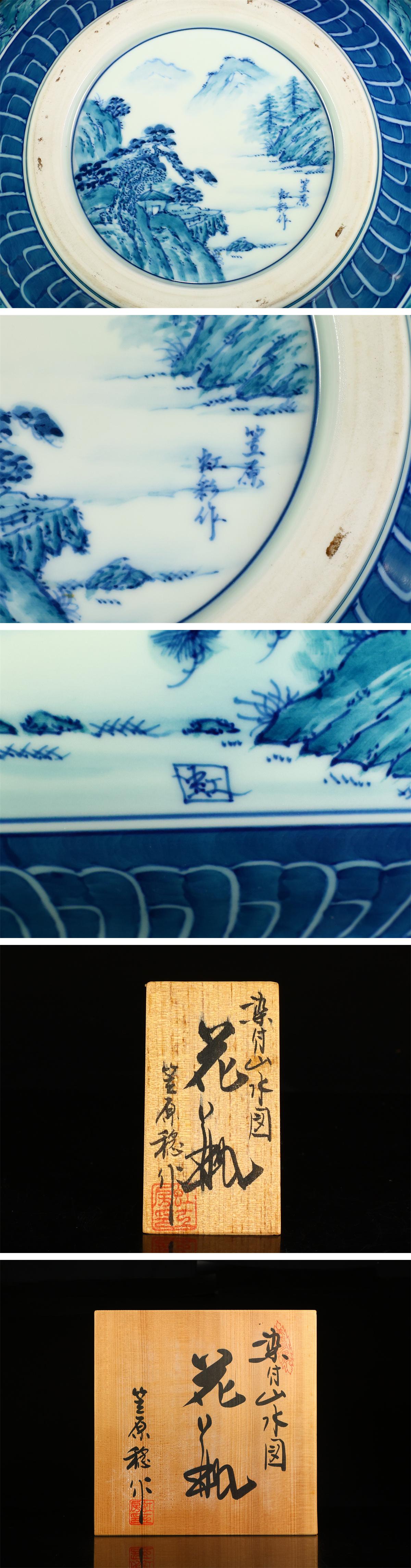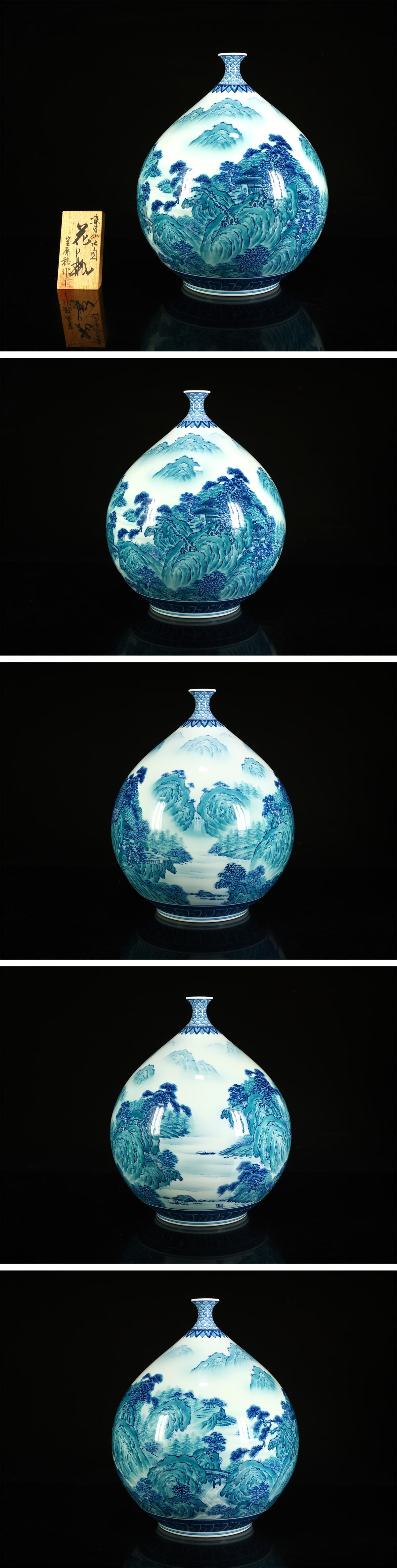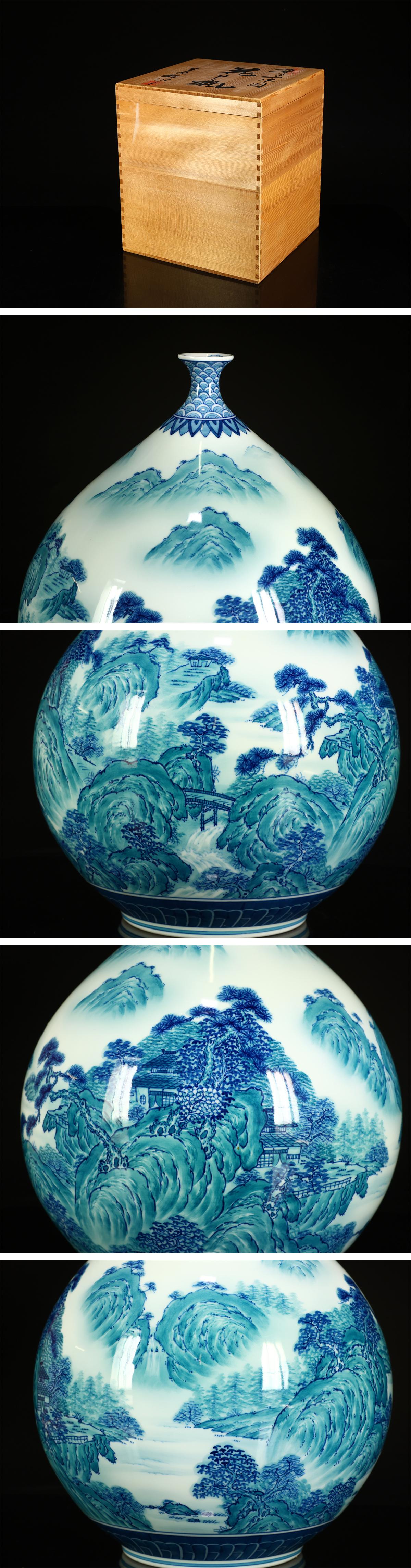 【吉】CM585 伝統工芸士 【笠原虹彩】作 有田焼染付 極細密山水紋 大花瓶 高30㎝/共箱付 本物保証 美品N! 收藏