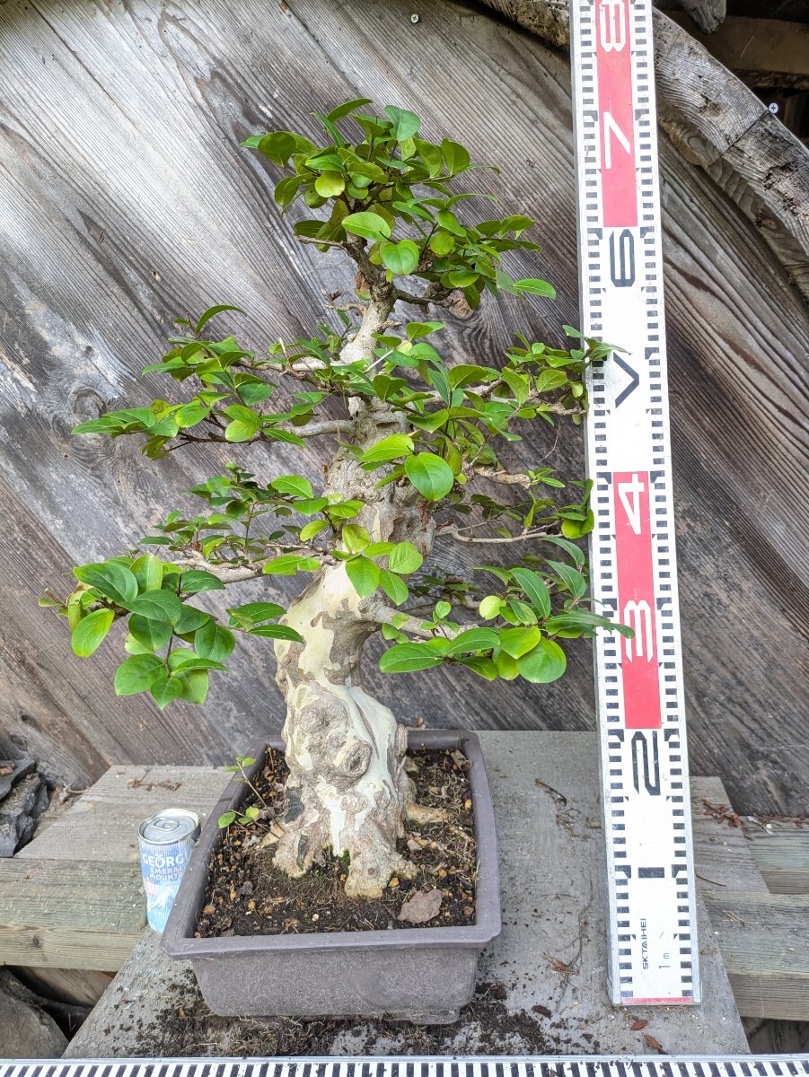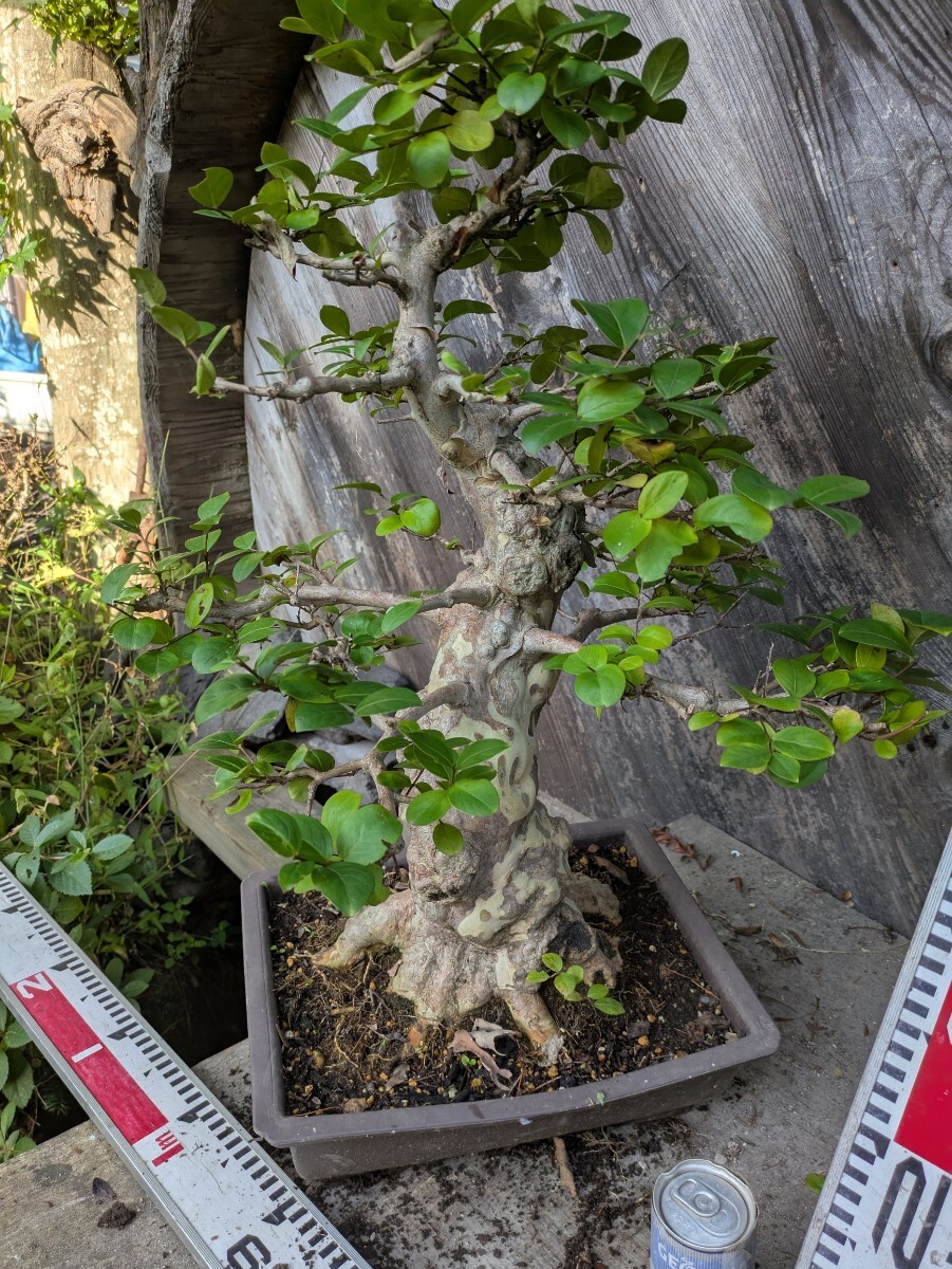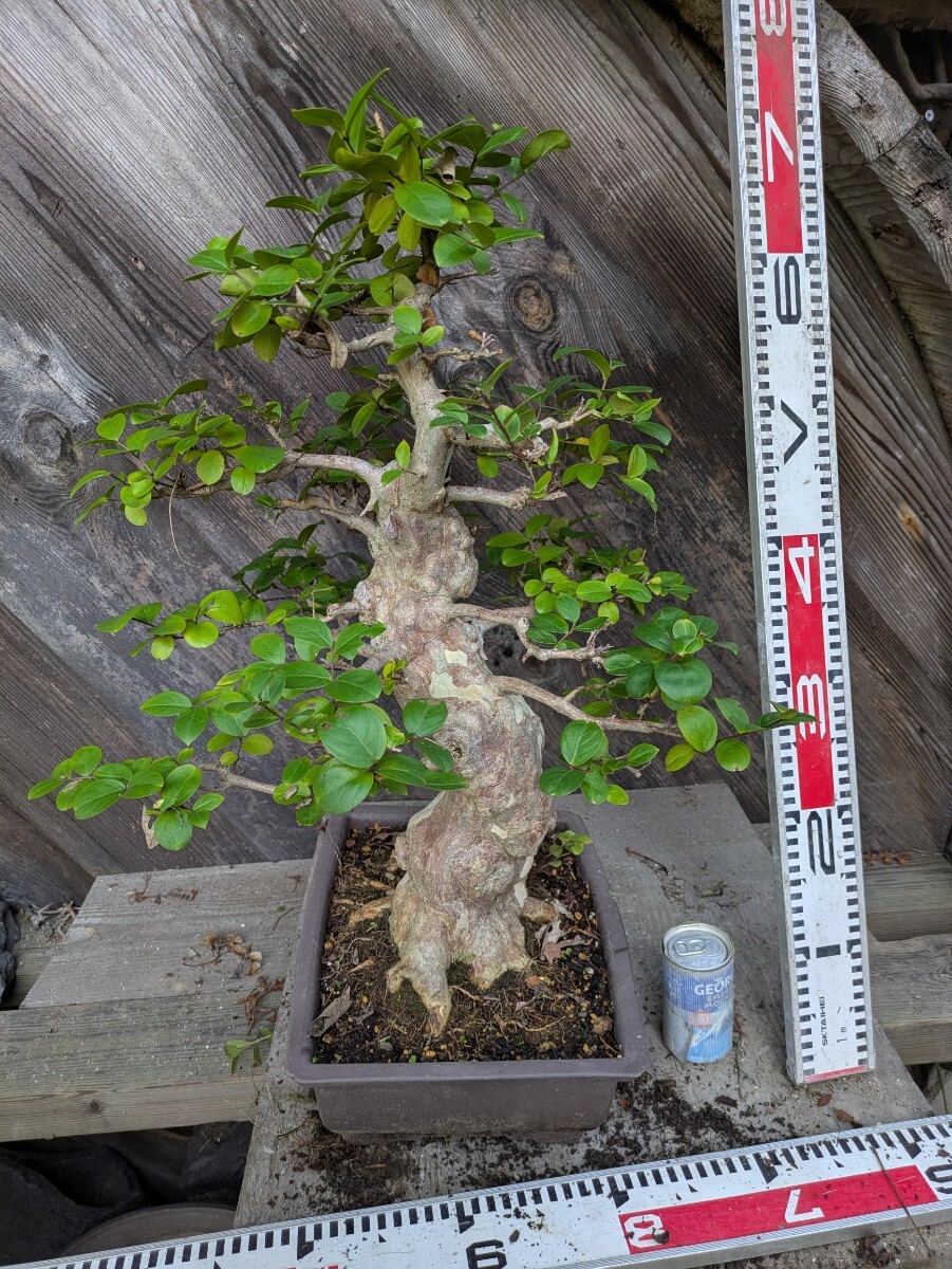 およそは43x43x65cmの枠に入るサイズ。根本付近からの高さは55cmくらい。盆栽鉢風のプラ鉢入り。長年の古木で主幹の肉乗りの進んだ木です。 撮影前に伸びた枝を切ってます。 定期的に切ってたので花は見てませんが白花だと思います。発送梱包の際に痛むヶ所が有るかもしれません。佐川急便にて発送する事も有ります。