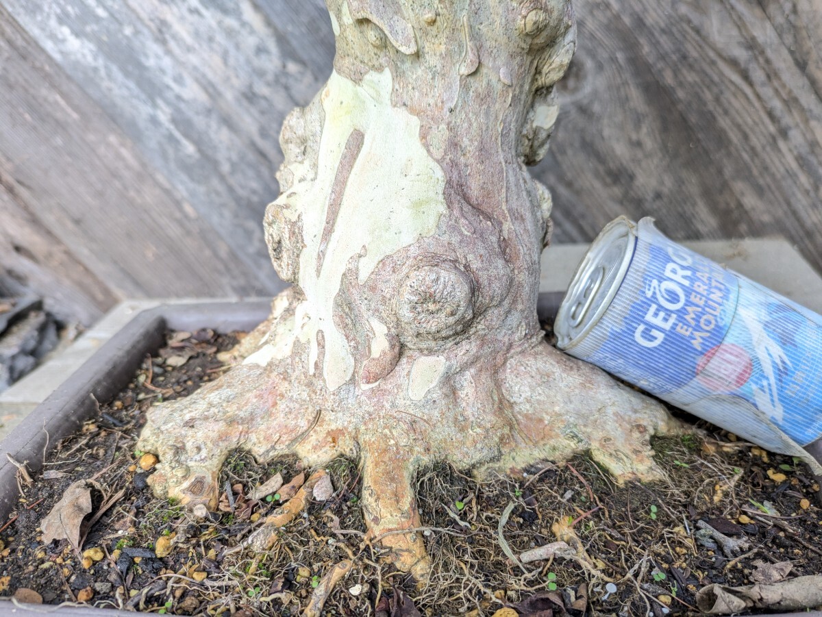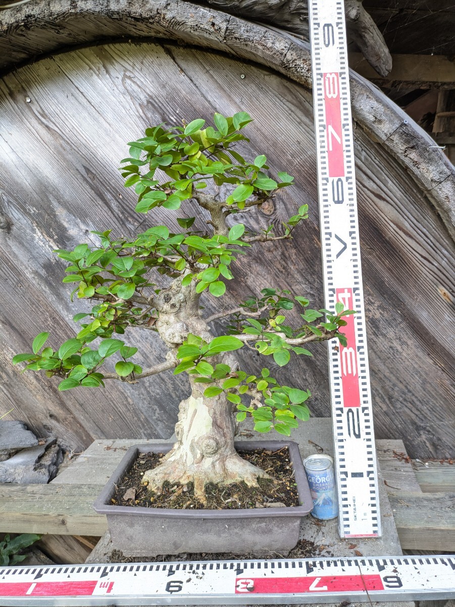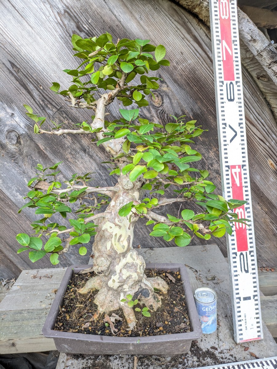 およそは43x43x65cmの枠に入るサイズ。根本付近からの高さは55cmくらい。盆栽鉢風のプラ鉢入り。長年の古木で主幹の肉乗りの進んだ木です。 撮影前に伸びた枝を切ってます。 定期的に切ってたので花は見てませんが白花だと思います。発送梱包の際に痛むヶ所が有るかもしれません。佐川急便にて発送する事も有ります。