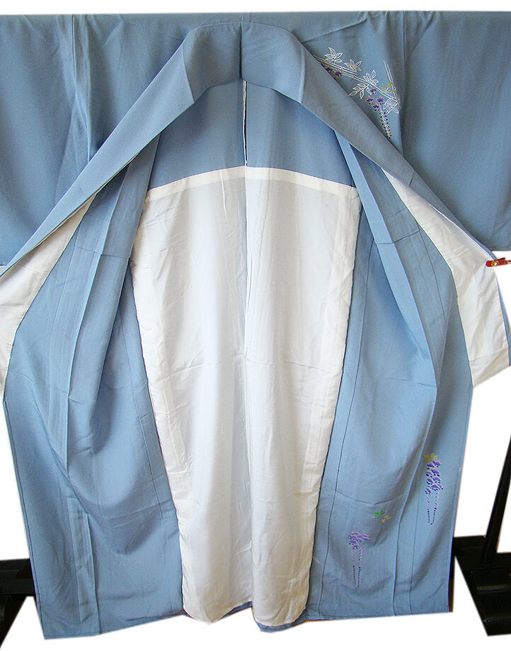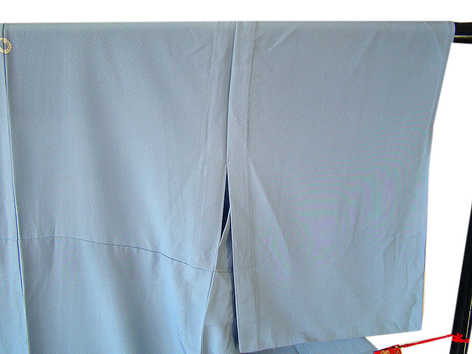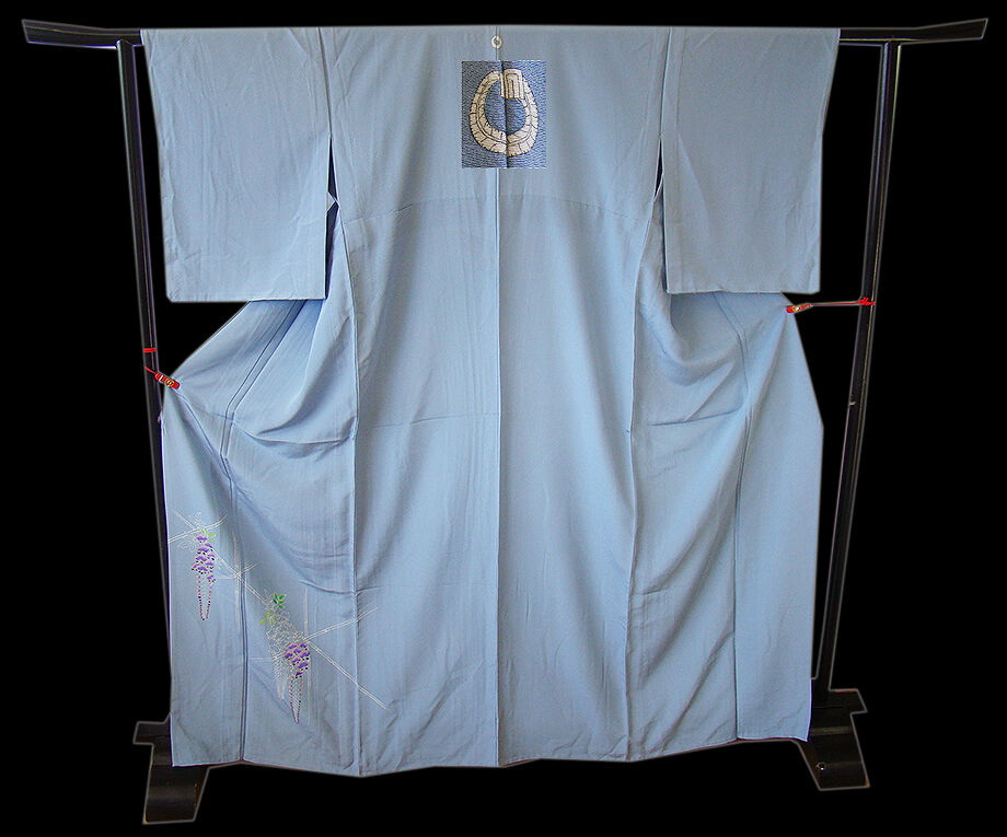 商品説明 | こちらのお品は「単衣」ですので5月、6月、9月にお召頂ければと思います。 着物には、大きく分けて「袷(あわせ)の着物」と「単衣(ひとえ)の着物」と「夏着物」があります。 反物(表地)を着物に仕立てるときに、裏地類をつけるものを袷の着物、 つけないものを単衣の着物と呼び、胴裏や八掛といった裏地がつかない一枚ものの着物です。 また裏地がないため、座る時などにヒップのラインが目立たないよう、 居敷当て(いしきあて)の生地をつけることもあります。 正絹の居敷当てが付いております。 しなやかで柔らかな手触りの着心地良いちりめん地の生地で涼やかな風合いです。 空色地に白、藤、紫色等の藤の花柄の染柄に金彩加工仕立て、 背に紋1ヶ入っております。 |