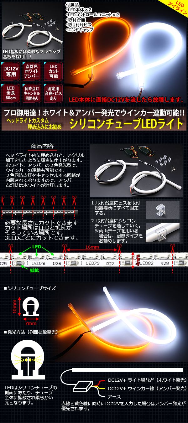 ■商品タイトル ヘッドライト 埋込専用 インナー シリコンチューブ LEDライト 60cm ■商品コード PZ182 ■発光色 ホワイト/アンバー ■数量 1セット ・LED本体×2 ・LEDコントロールユニット×2 ・取付台座 ・取付ビス ・エンドキャップ(LED本体に取り付いております。) ■対応電圧 DC12V ■カットに関して LEDはカットし短くして使用可。カット箇所は画像を参考にしてください。 コントロールユニットを通さず、直接DC12VをLED本体に流すと壊れます。 ■特徴 アクリル加工をしたようなLEDアイラインが可能な インナーLEDキットです。 ■コントロールユニット機能 アンバー点灯時はホワイト消灯。 アンバー消灯後、ホワイト点灯復帰時間は時間があるため、 ウインカーとしてご利用時は両方とも消灯可能。 ■注意事項 当商品は、玄人様専用アイテムです。取り付けには、ライトの殻割り等、専門的な技術・知識が必要です。 施工は必ず、専門業者様にご依頼下さい。商品の性質上、取付後の保証は一切致しませんので、取付前に十分な点灯確認をお願いします。説明書の付属はなく、取り付けのサポートも一切行っておりません。 防水機能はございません。 ■その他関連商品 その他のヘッドライト インナーランプ デイライト LEDコントローラー スイッチ(有線、無線) |