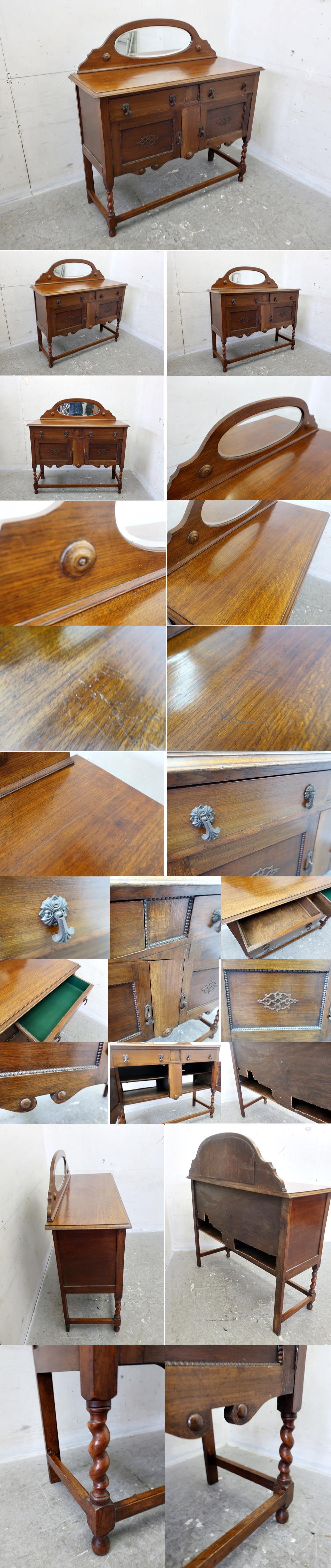 イギリスアンティークのキャビネットのご紹介です。 イギリスアンティークのキャビネットは、伝統的なデザインと優れた職人技が光る一品です。 特に目を引くのは、キャビネットの脚部に施されたバーリーツイストレッグと呼ばれるねじれた柱のようなデザインです。 このスタイルは、16世紀から17世紀にかけてのバロック時代に好まれたもので、 装飾的でありながらも、どっしりとした安定感を感じさせます。 また、上部には楕円形の鏡が取り付けられており、実用性と美しさを兼ね備えています。 この鏡は、単に物を映すための道具ではなく、空間を広く見せる効果があり、インテリアの一部としても魅力的です。 キャビネット本体には、引き出しと収納スペースが複数あり、収納力も十分です。 収納扉や引き出しには、繊細な彫刻が施されており、その細かなディテールは、当時の職人技の高さをうかがわせます。 このような装飾は、単なる家具としての機能を超え、家の中に置くことで一種の芸術作品のような存在感を放ちます。 このキャビネットは、リビングやダイニング、玄関など、さまざまな空間に設置することができ、 そのクラシカルなデザインが、どんなインテリアスタイルにも調和します。 また、ヴィンテージ家具ならではの時を経た風合いが、空間に深みと落ち着きをもたらします。 アンティークファンやクラシックなインテリアを愛する方には、特におすすめの一品です。 大変おすすめですのでこの機会にぜひ!!! コンディション:背板に穴、鍵欠品があります。中古のため写真のように傷、汚れなどありますが使用には問題ありません。。 サイズ横120センチ奥行き45センチ高さ121センチです。