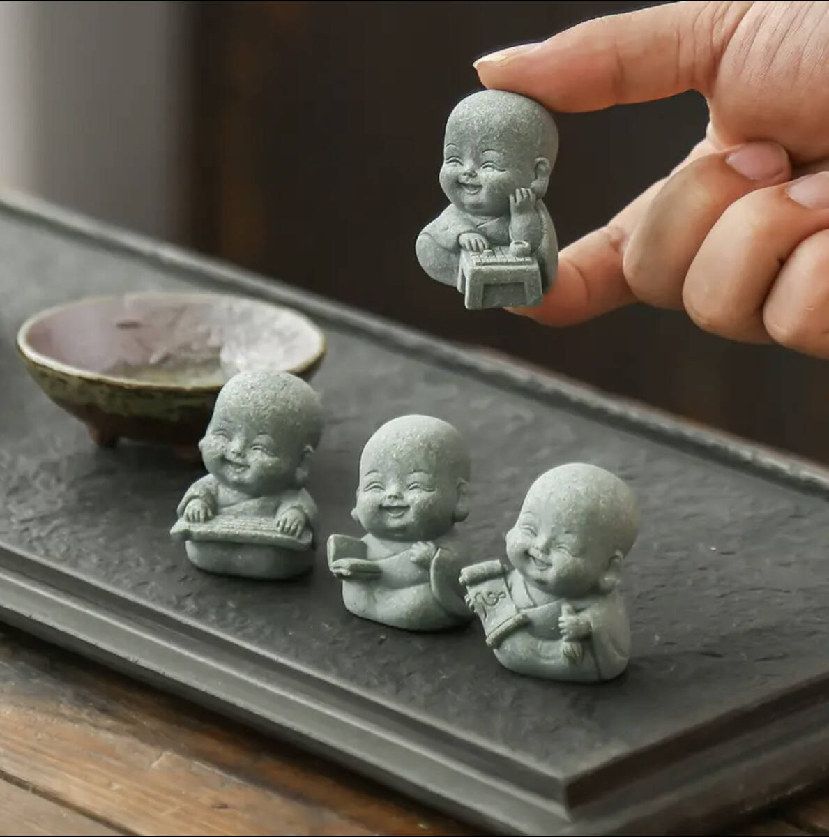 可愛い笑顔 【琴棋書画 小僧 4体セット】 小さな仏像 お守り 石像 彫刻 文人 茶室 茶道 置物 インテリア 收藏
